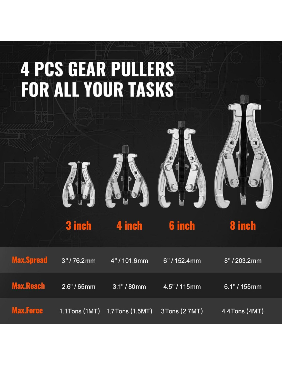 - Juego Completo de 4 Piezas: Realiza el trabajo correctamente con nuestro juego profesional de extractores de engranajes de 4 piezas. El kit incluye 4 extractores de engranajes con diferentes expansiones máximas (3" (7,62 cm), 4" (10,16 cm), 6" (15,24 cm) y 8" (20,32 cm)) para manejar una amplia gama de trabajos de desensamble como engranajes, poleas, rodamientos y volantes. Perfecto para mecánicos, talleres de reparación y más.