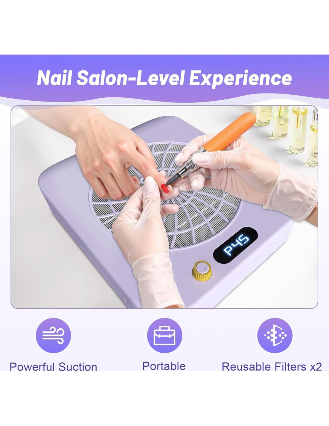 - Succión Potente Ajustable: El colector de polvo de uñas ofrece potencia personalizable con 45 configuraciones de velocidad para manejar el polvo de limado de uñas o la eliminación de escombros pesados, proporcionando a ti y a tus clientes un ambiente libre de polvo mientras liman o pulen las uñas