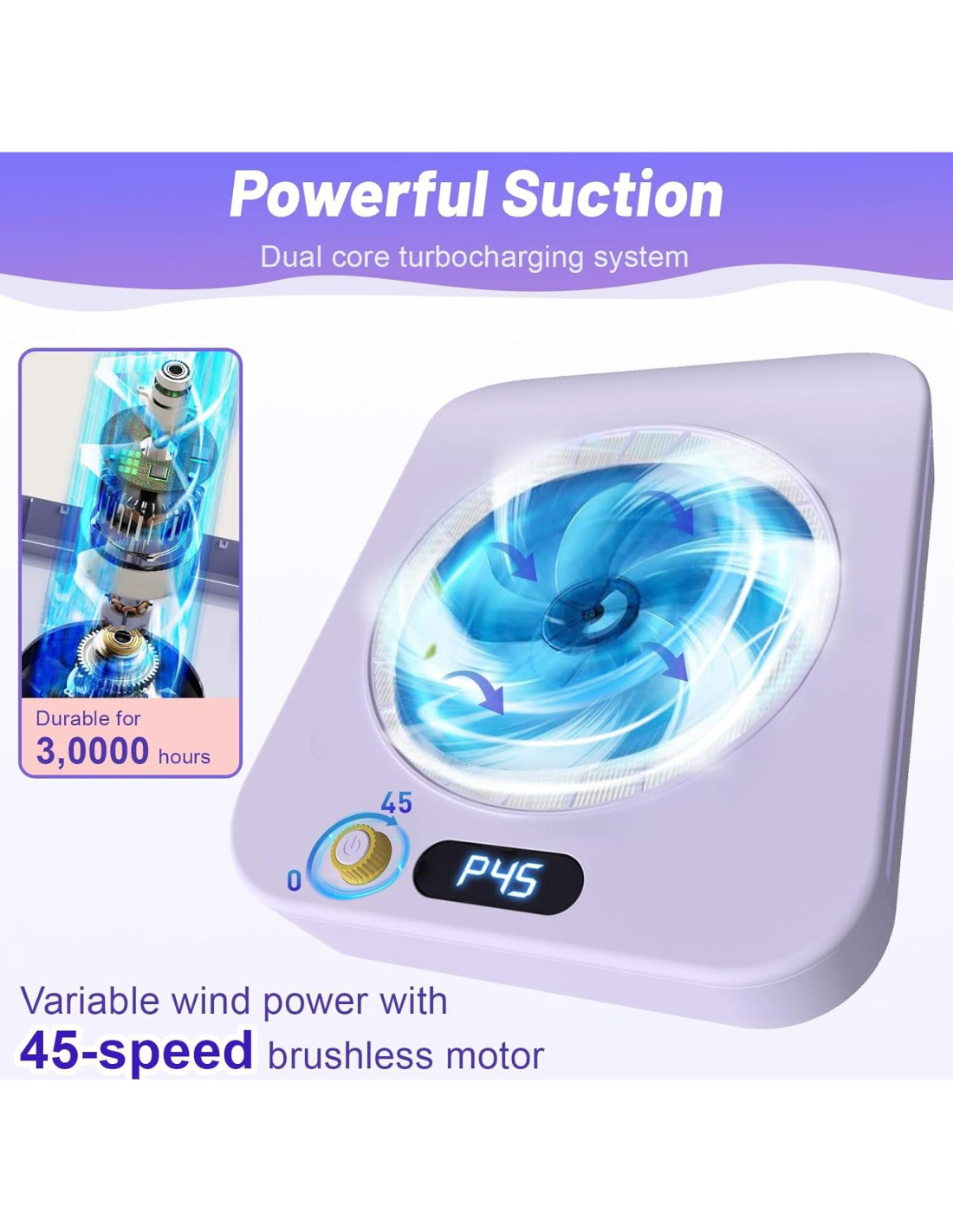 - Disipación de Calor Eficiente: El colector de polvo de uñas cuenta con grandes orificios de ventilación en la parte posterior, asegurando una continua disipación del calor. Incluso durante el uso prolongado, se mantiene fresco. Equipado con un ventilador turbo sin escobillas, proporciona una fuerte succión con bajo ruido, manteniendo tu espacio de trabajo libre de polvo