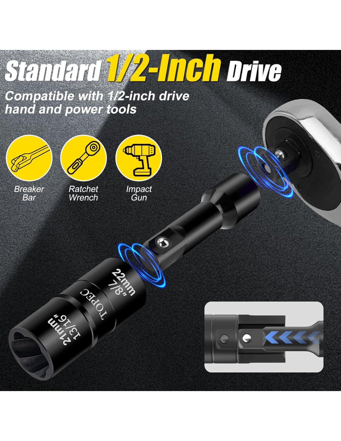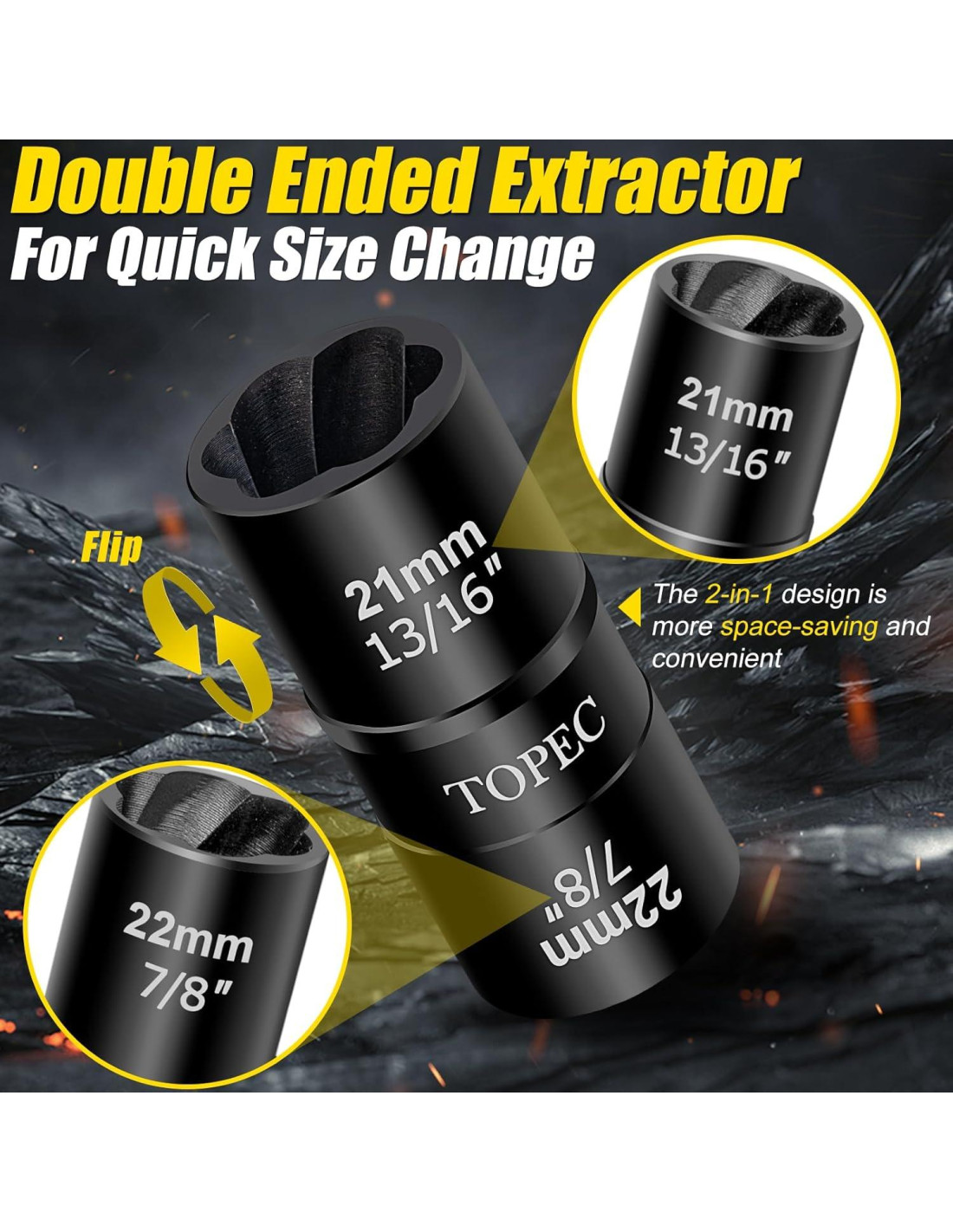 - [TAMAÑOS DIVERSIFICADOS CON LÁSER] Las partes del kit de removedor de tuercas flip tienen marcas de tamaño grabadas con láser, 1/2" de transmisión cuadrada, 11/16" (17mm)-3/4" (19mm), 13/16" (21mm)-7/8" (22mm), 15/16" (24mm)-1" (25mm), 1-1/32" (26mm)-1-1/16" (27mm)