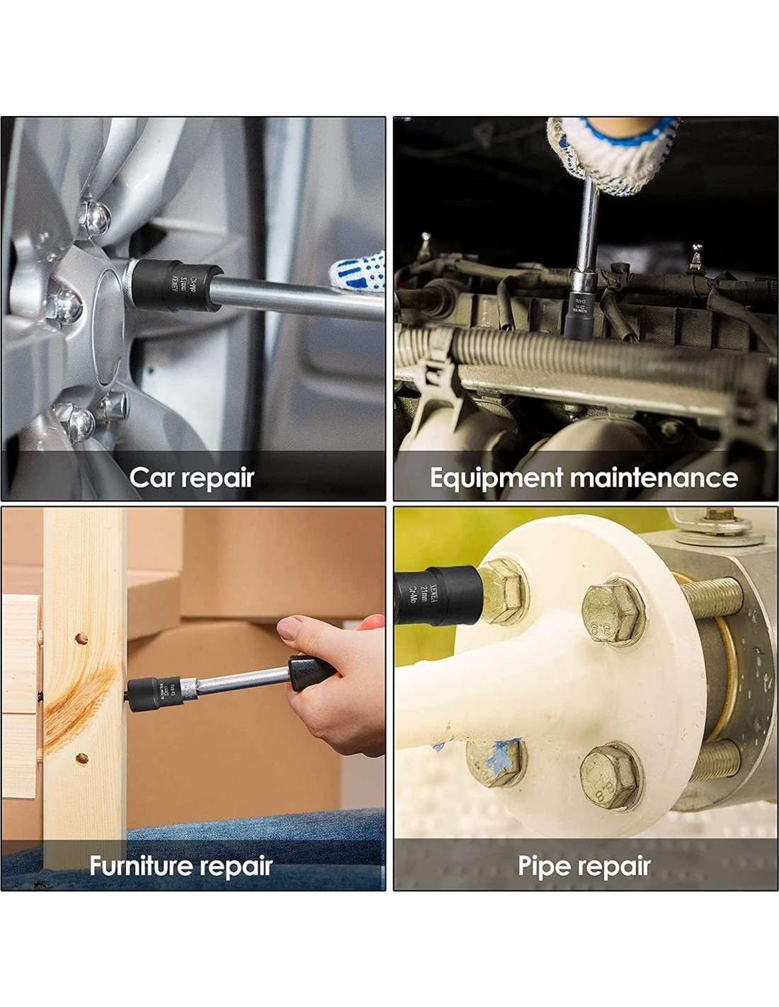 - Alta Calidad - Nuestro juego de herramientas está hecho de material de acero de cromo-molibdeno de alta dureza y ha sido tratado con fosfatado negro para prevenir aceite y óxido. Puede usarse con la mayoría de las herramientas, como llaves de impacto, trinquetes manuales y neumáticos, llaves hexagonales, llaves de extremo plano, llaves ajustables, alicates y enchufes.