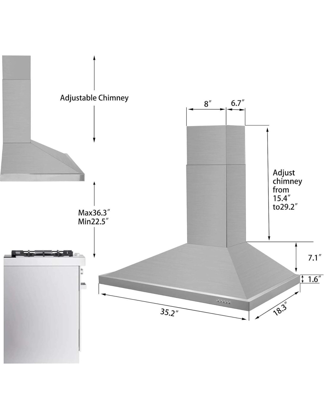 - Adecuada para Techos Bajos y Altos Presenta un tamaño de 30 cm perfecto para cubrir toda la superficie de cocción de la estufa. Las dimensiones de la campana de estufa son 89.4 cm W x 46.4 cm L x 96.5 cm H con chimenea ajustable que se adapta a techos de 2.3-2.6 m. Idealmente dimensionada para adaptarse a sus gabinetes y ahorrar espacio en su cocina. Extensible hasta 3 m de altura con extensión, se necesita vender por separado (Parte #USGDEX-01)