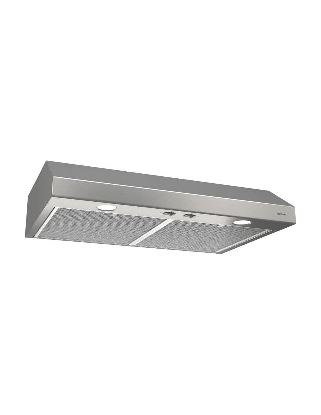 Mejora tu cocina con la Campana Extractora Broan-NuTone Glacier de 76.2 cm para Bajo Gabinete! Este versátil inserto de campana extractora ofrece una solución completa a tus necesidades de ventilación al proporcionar tanto un ventilador de escape como una luz superior para tu estufa. Esta campana extractora proporciona un rendimiento de soplador de 300 CFM y 5.0 Sones para eliminar rápidamente el humo y los olores de cocina del aire, y el interruptor oculto de 2 velocidades permite ajustes rápidos del ventilador y proporciona el nivel ideal de ventilación cada vez que cocinas. También cuenta con el sistema Captur: un diseño de soplador avanzado con una entrada centrada posicionada hacia adelante para eliminar el 97.4% del humo y los olores más rápido. Las luces integradas de 2 niveles aceptan bombillas halógenas de hasta 50 vatios (no incluidas) para iluminar uniformemente tu área de cocina, y también se controlan mediante un interruptor oculto para mayor facilidad de uso. Esta elegante campana extractora de acero inoxidable se ajusta perfectamente debajo de los gabinetes, y presenta lados biselados y un fondo doblado sin bordes afilados para ayudar a garantizar la seguridad y proporcionar un aspecto más decorativo. Los dos filtros de grasa de malla abierta a prueba de lavavajillas de una sola pieza ofrecen una limpieza fácil para que puedas mantener una captura óptima de grasa y mantener tu cocina ventilada. Esta unidad de campana extractora convertible de 4 vías mide 50.0 cm x 76.2 cm x 15.2 cm y se instala como una abertura ductada de 8.3 cm x 25.4 cm conectada vertical u horizontalmente con un regulador, ducto vertical redondo de 17.8 cm (regulador se vende por separado), o como no ductada con recirculación de aire (filtro se vende por separado) para proporcionar opciones de instalación versátiles al menos 45.7 cm por encima de la superficie de cocción. Incluye louveres ocultos en la parte superior de la campana que expulsan el aire lejos de los gabinetes. También puede funcionar en una aplicación compatible con ADA. Está listado por UL y certificado por HVI-2100 para seguridad y protección, y incluye una garantía limitada de 1 año. ¡Mejora tu cocina con la Campana Extractora Broan-NuTone BCSD130SS!