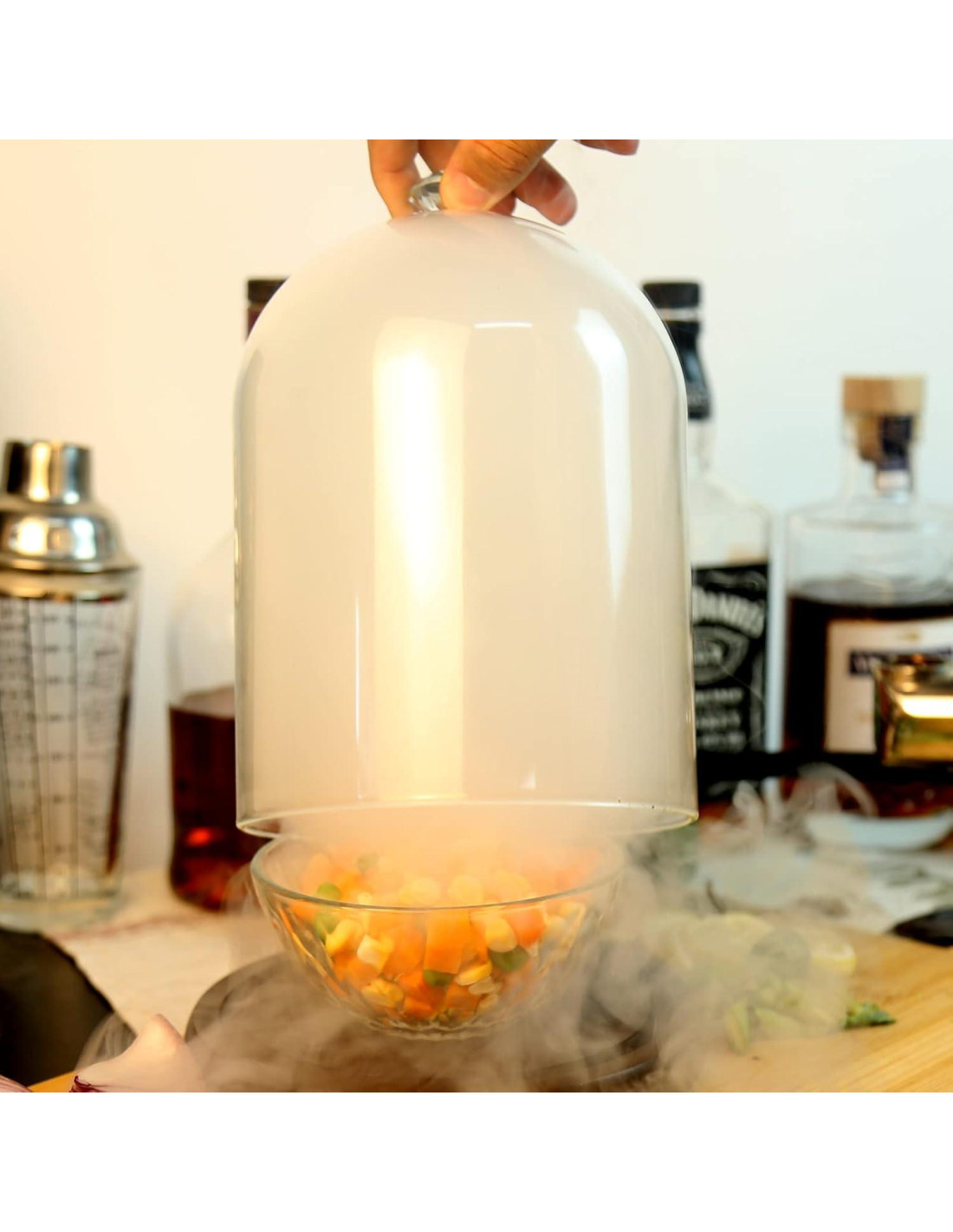 - Perfecto en Diseño: Una cúpula de vidrio clara con perilla decorativa para que puedas moverla fácilmente. Vidrio con puerto de silicona que permite su compatibilidad con diferentes tipos de Pistolas de Humo e Infusores. La base de madera de nogal rústico añade más belleza y posibilidades, lo que permite sostener tazas, vasos, platos pequeños o colocar comida directamente sobre ella y en la cúpula.