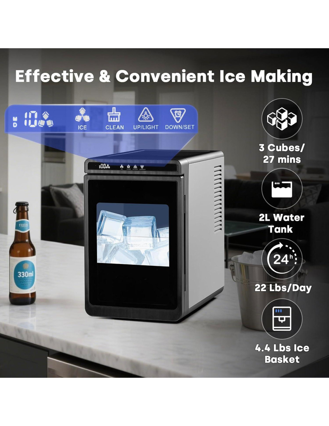 - Di adiós a las distracciones ruidosas, nuestras máquinas de hielo operan a tan solo 40db. Mantén una atmósfera pacífica mientras produces hielo. Ya sea que lo uses en tu cocina, oficina o cualquier entorno interior, el temporizador de 24 horas te permite programar la producción de hielo con anticipación, ¡despierta con una canasta de hielo llena!