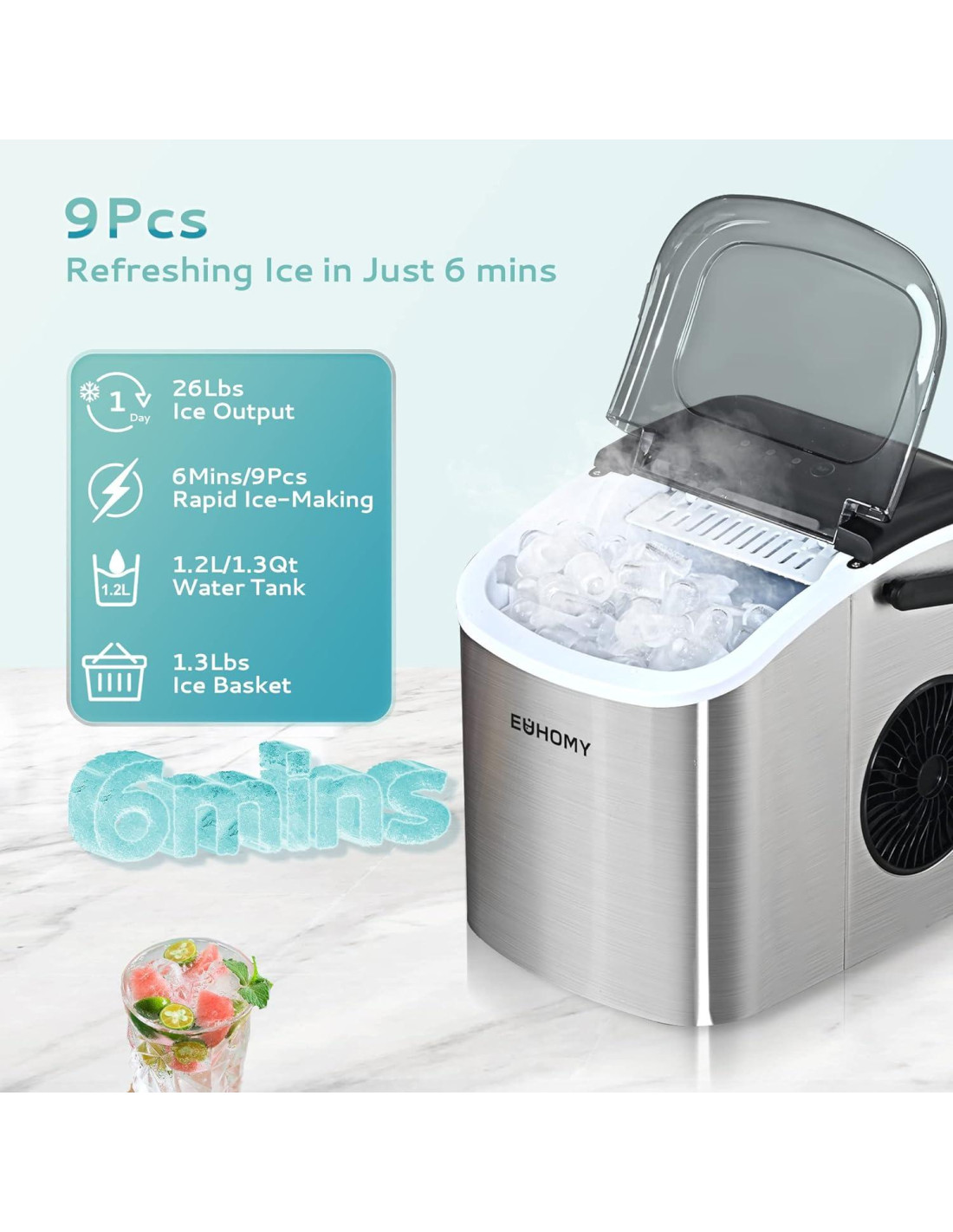 - Hacer Hielo en 6 Min y Ultra Silenciosa: Nuestra máquina de hielo Euhomy solo tarda 6 minutos en disfrutar del primer lote de hielo en forma de bala fresco. Con un tanque de agua de 1.2L y un compresor potente, la máquina de hielo portátil produce fácilmente una capacidad máxima de 26 lbs (11,79 kg) de hielo por día y puede contener hasta 1.3 lbs (0,59 kg) de hielo a la vez. Además, nuestra máquina de hielo no solo es excelente en refrigeración, sino también con un ruido normal de menos de 45db, asegurando un ambiente cómodo y silencioso para disfrutar de la producción de hielo, similar a un congelador en funcionamiento.