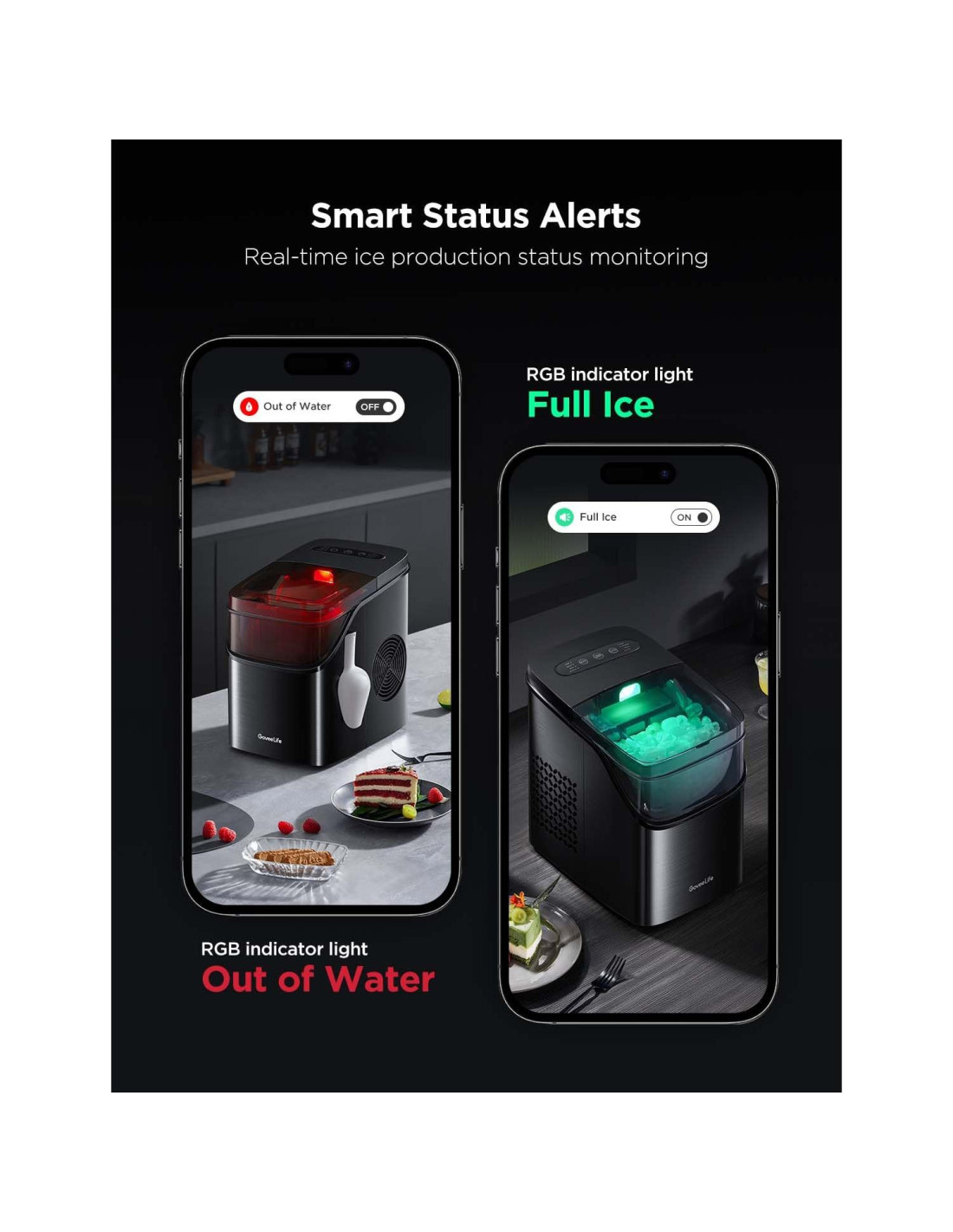 - Wi-Fi Integrado y Control por Voz: Empareja tu máquina de hielo con la aplicación. Usa comandos de voz a través de Alexa y Google Assistant para una variedad de funciones inteligentes. Monitorea el estado del dispositivo y programa hielo fresco en cualquier momento y lugar. (Solo soporta Wi-Fi de 2.4GHz).