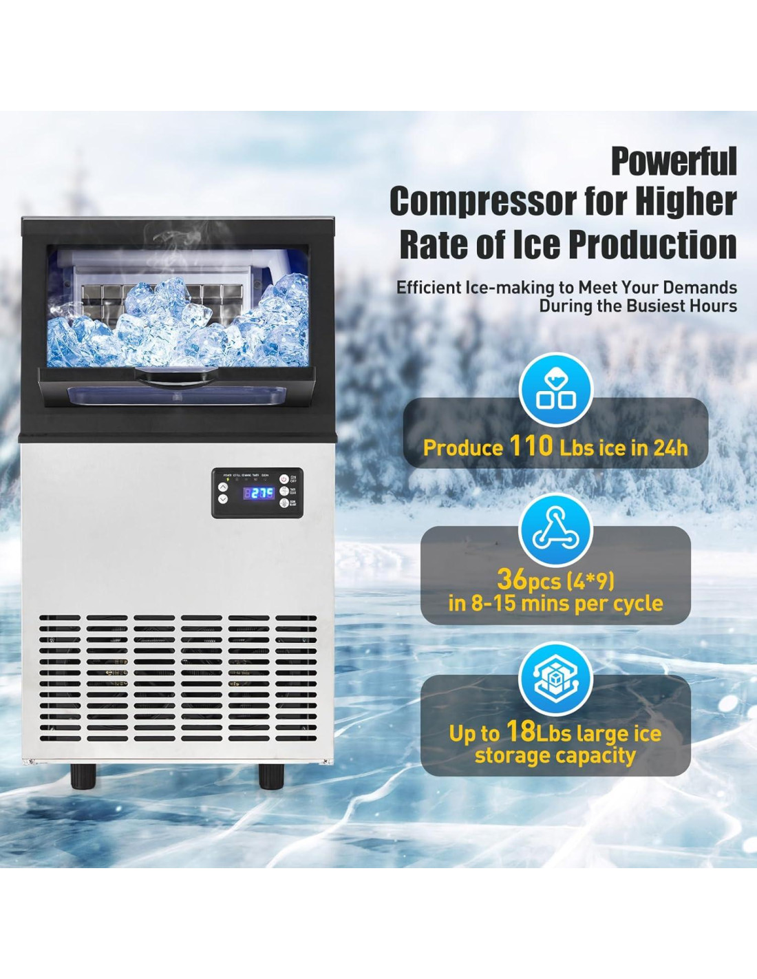 - Eficiencia y Capacidad: Ofreciendo una capacidad de producción de 90-110lbs (40,82-49,89 kg) de hielo por 24 horas y un ciclo rápido de 8-15 minutos, esta máquina de hielo proporciona una conveniente capacidad de almacenamiento de hielo de 18lbs (8,16 kg), lo que la convierte en una opción ideal para hogares, oficinas, pequeños restaurantes, bares y cafeterías.
