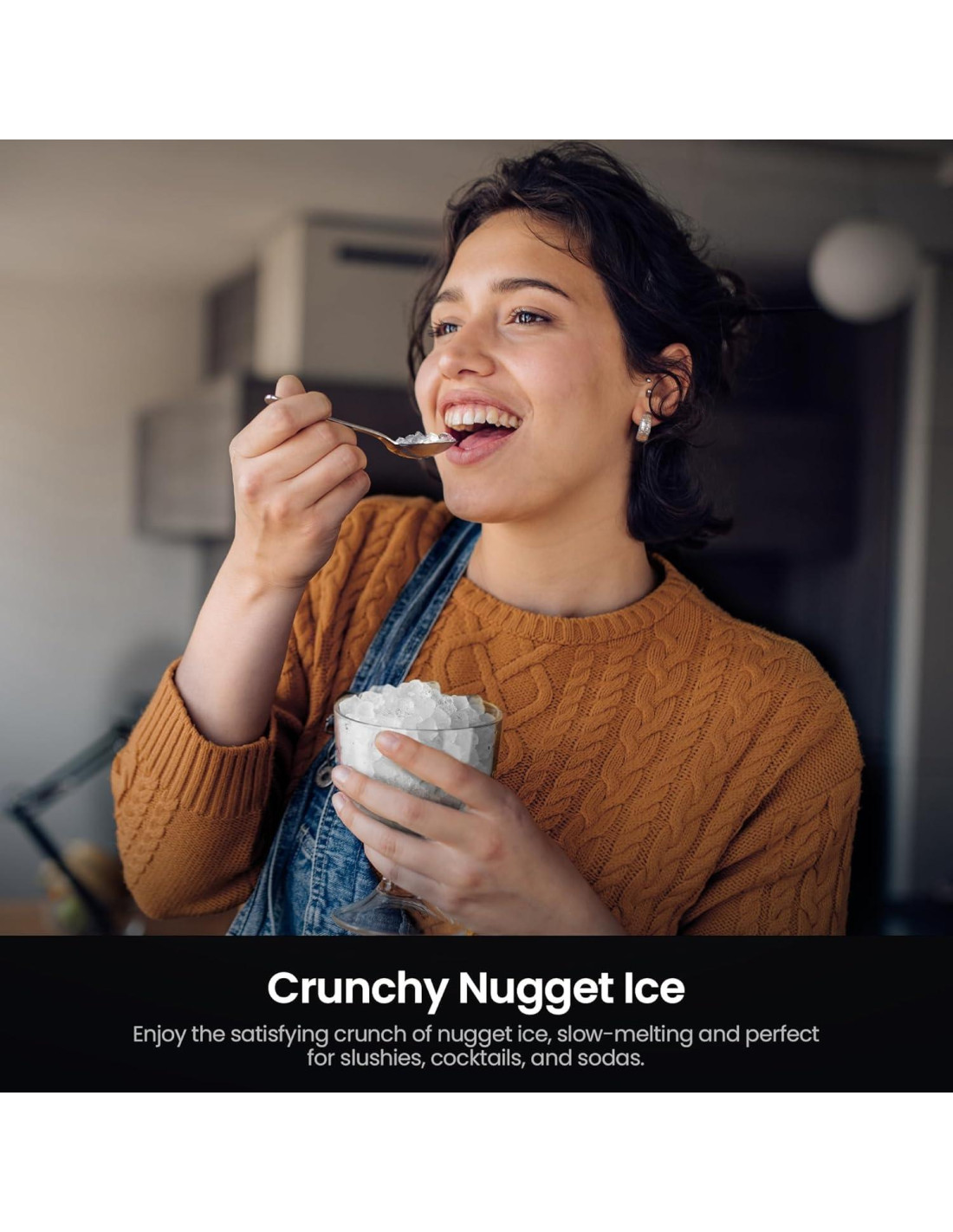 - [Hielo Nugget Masticable] Elaborado por la máquina de hielo triturado, el hielo nugget masticable se destaca. Su deliciosa crocancia proviene de copos de hielo compactados y en capas, con una fusión lenta y una textura superior. Ideal para granizados, cócteles, refrescos y más, preserva los sabores auténticos como ningún otro hielo.