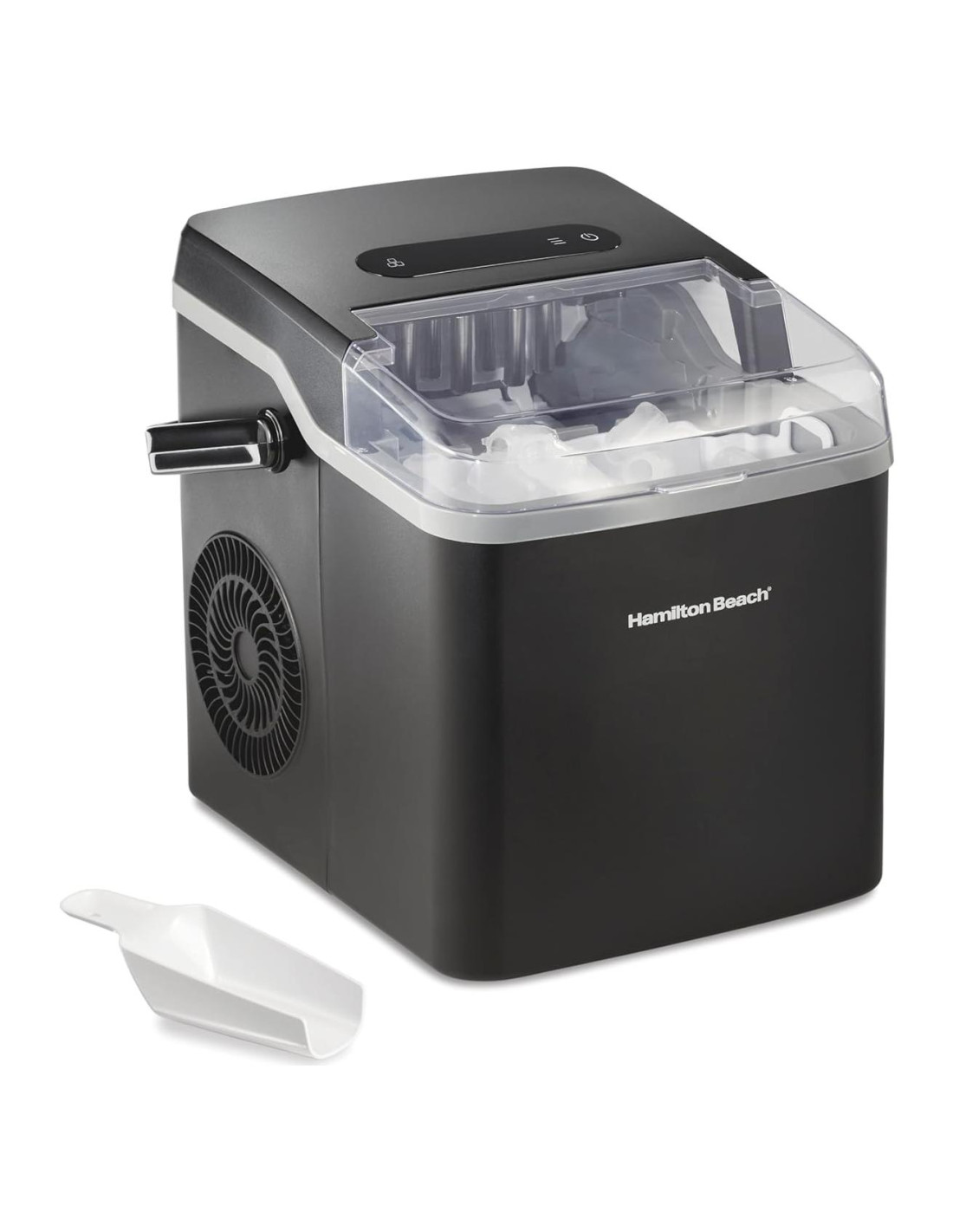 La Máquina de Hielo de Encimera Hamilton Beach con Mango de Fácil Transporte hace un lote de hielo en tan solo 6 minutos y produce hasta 11.79 kg (26 lbs) de cubos de hielo grandes o pequeños diariamente. Incluye controles de un toque con ciclo de limpieza, cuchara y cesta de hielo.