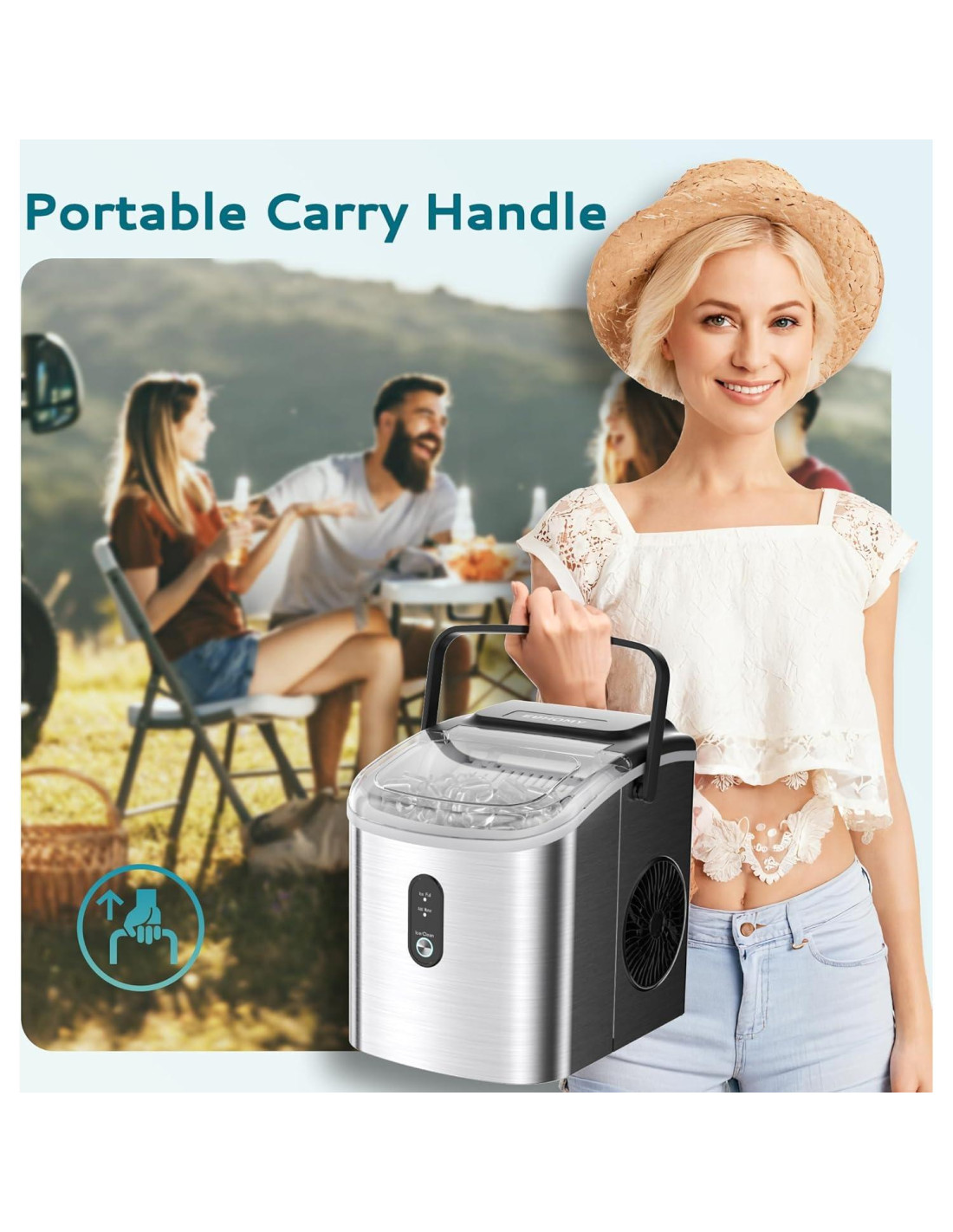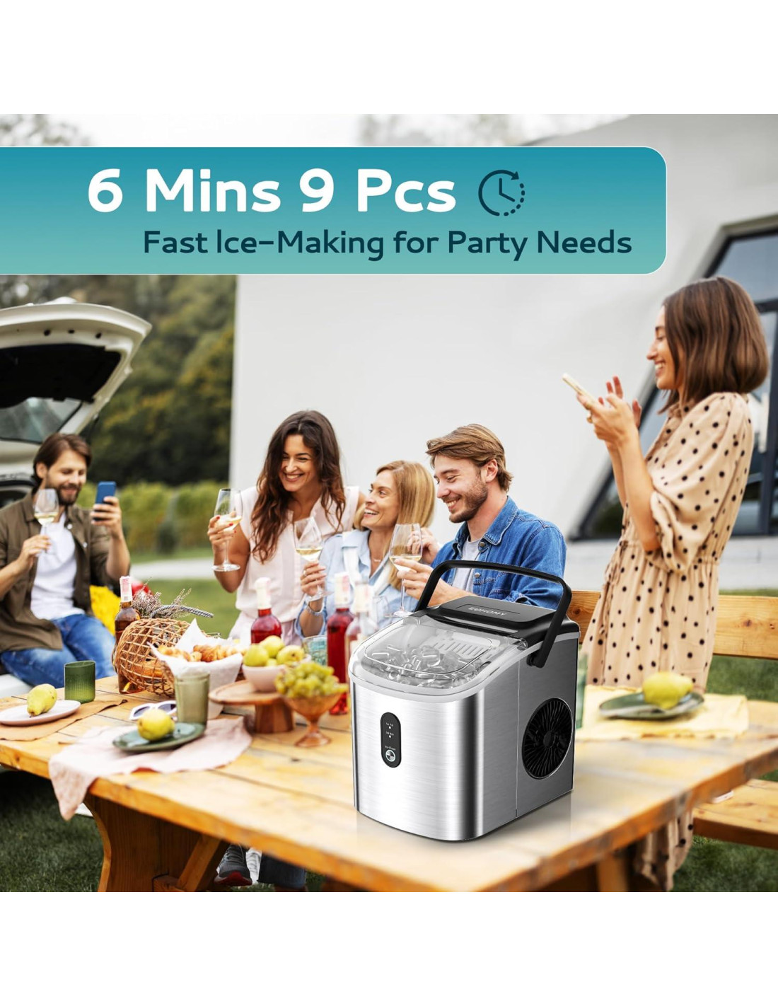 - Diseño Portátil y Excelente Hielo en Bala: Nuestra máquina de hielo viene con un mango resistente, pesa solo 13.38 lbs (6,06 kg) y tiene un tamaño compacto de 9.25 (23,50 cm) x 11.54 (29,27 cm) x 11.61 (29,50 cm) pulgadas. Estas características hacen que la máquina de hielo sea fácil de transportar y funcione bien en cualquier ocasión como Cocina/Hogar/Camping/RV. Además, la máquina de hielo de encimera de nuevo diseño produce los cubos de hielo en forma de bala más populares, que no se pegarán fácilmente ni lastimarán tus manos o boca, siendo excelentes para bebidas frías o café helado.