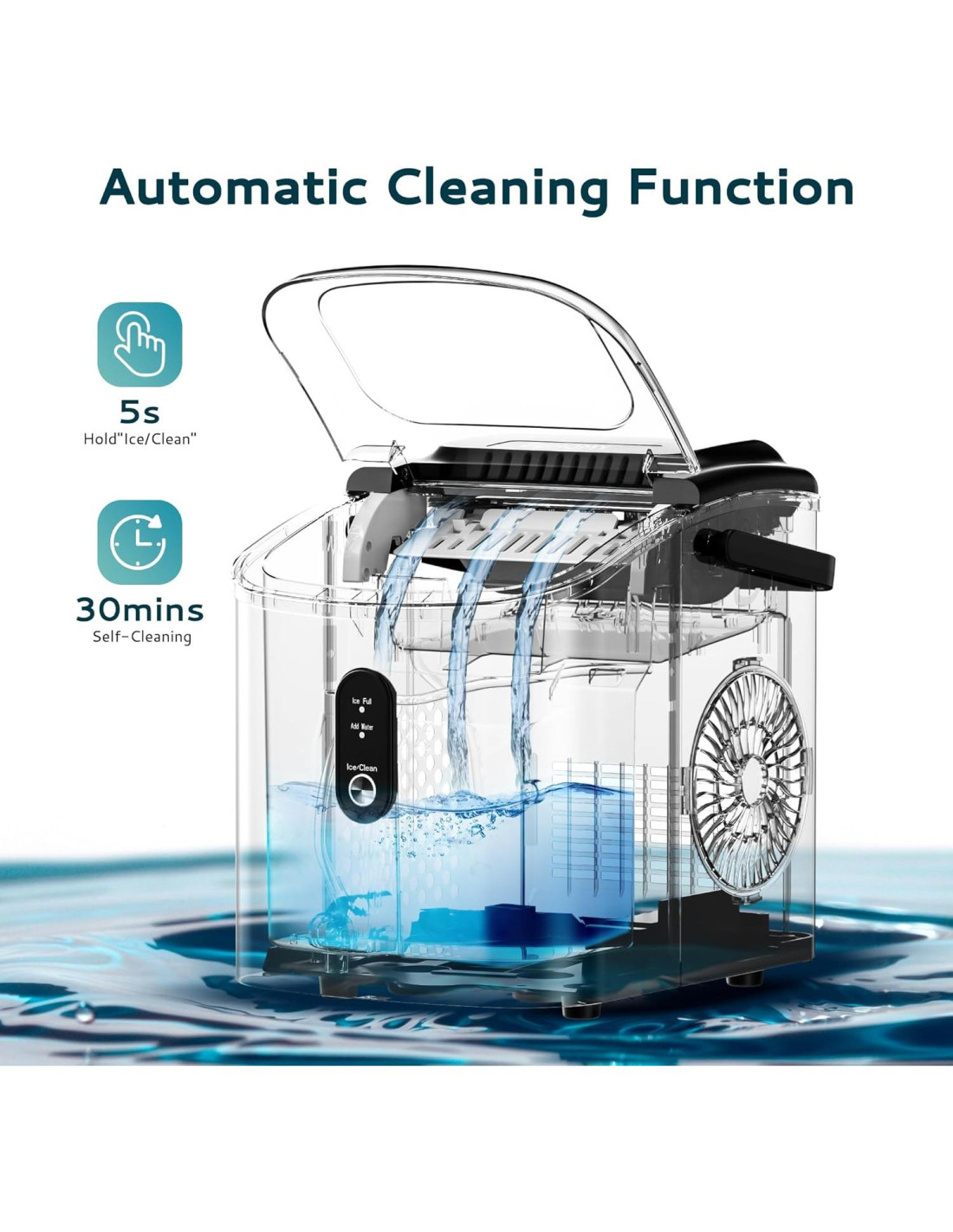- Diseño Inteligente y Auto-Limpieza: La máquina de hielo tiene un sensor infrarrojo avanzado. La luz indicadora "HIELO LLENO" se encenderá cuando la cesta esté llena. Y te recordará agregar agua parpadeando "AGREGAR AGUA". Además, la máquina de hielo compacta tiene una función de auto-limpieza con un solo toque. Presiona el botón "Hielo/Limpieza" durante 3 segundos después de agregar agua para activar el modo automático durante 30 minutos, permitiéndote limpiarla rápida y fácilmente.