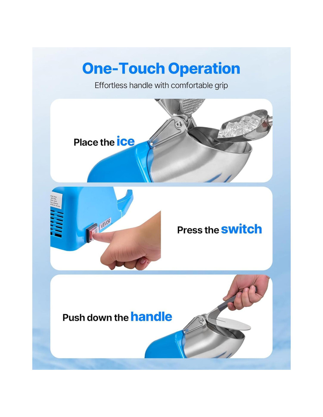 - Trituración Fácil: La máquina de conos de nieve cuenta con operación de un solo toque, solo carga el hielo, presiona el interruptor y empuja el mango ergonómico para comenzar a triturar. Es fácil, eficiente y el mango es cómodo de usar.