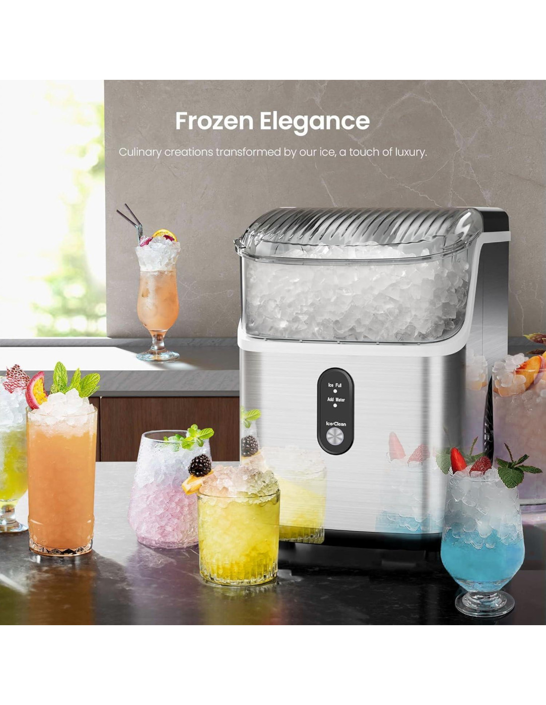 - [Disfruta del Hielo Masticable Nugget] Este hielo suave y parecido a perlas mejora cada sorbo, añadiendo un toque de lujo a tus bebidas. ¡Disfruta de un enfriamiento más rápido con la mayor área de superficie de este delicioso hielo! El hielo nugget, con su derretimiento lento y textura masticable, es el hielo definitivo para las bebidas.