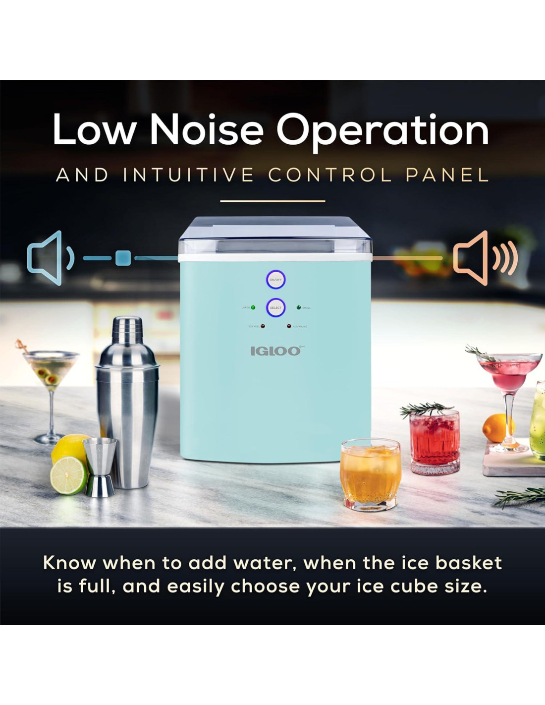 - PANEL DE CONTROL: Simple de entender e iluminado con luces LED, el panel de control electrónico te informa cuándo necesitas agregar agua, cuándo la canasta de hielo está llena y te permite elegir el tamaño de los cubos de hielo