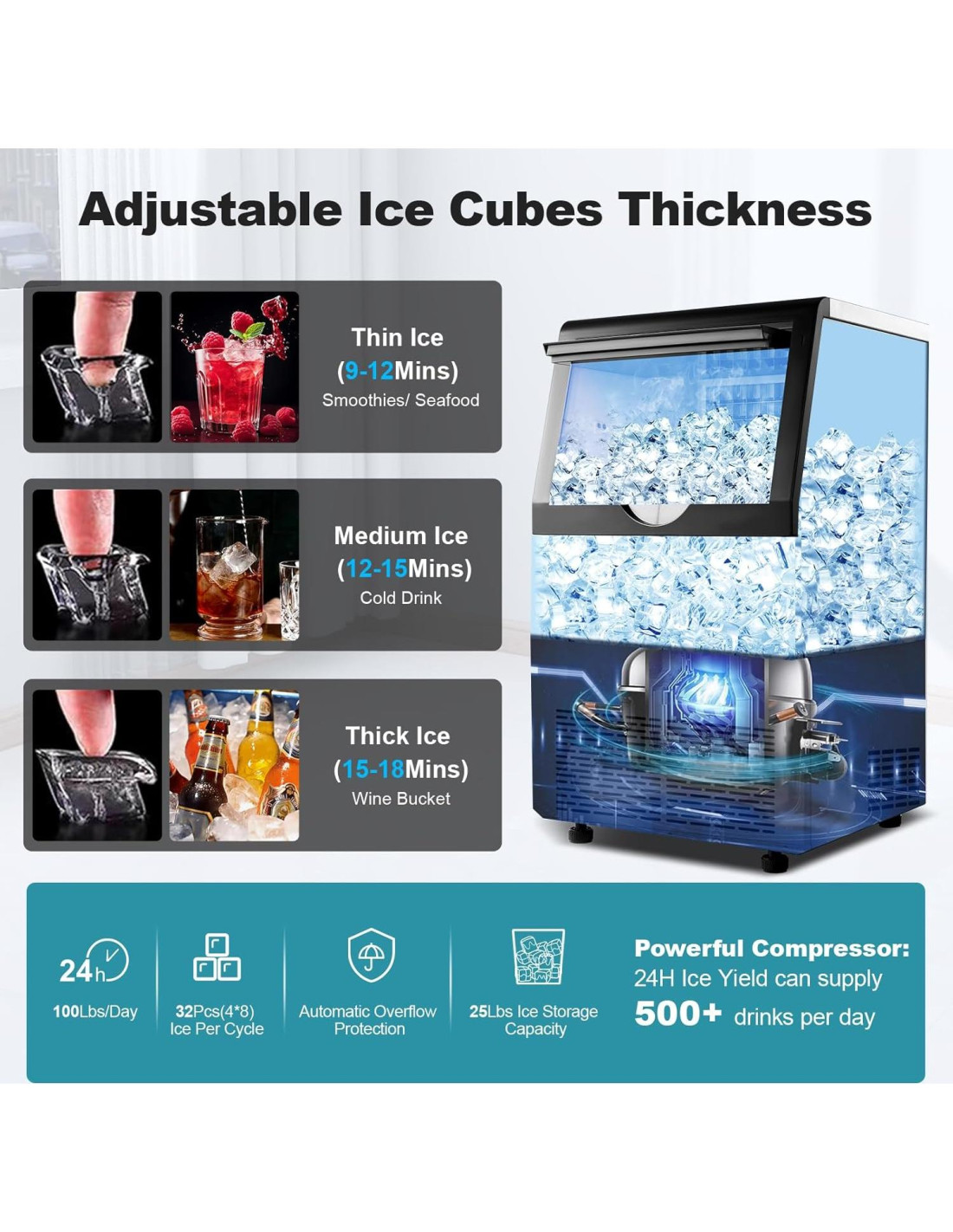 - Máquina de Hielo Comercial 100Lbs/24H: Diseñada con 32 cubos de hielo, nuestra máquina de hielo comercial puede producir hasta 100 lbs (45,36 kg) de hielo por día. Se puede instalar de dos maneras: Bajo Mostrador o Independiente. Con una capacidad de almacenamiento de 25lbs (11,34 kg), esta máquina de hielo bajo mostrador es perfecta en Cocina/Casa/Garaje/Bar, o en Oficina/Restaurante/Hotel/Tienda
