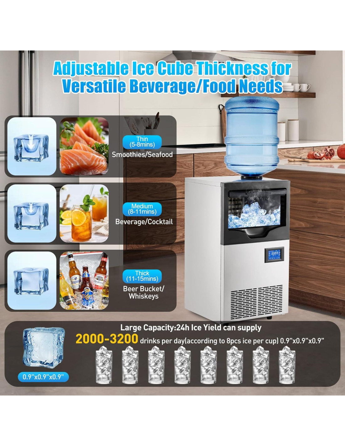- Construcción y Aislamiento Premium: Construida con acero inoxidable cepillado de alta resistencia y un revestimiento de PP de grado alimenticio, esta máquina de hielo cuenta con una apariencia lujosa y una durabilidad excepcional. La capa de espuma de ciclopentano de seis lados proporciona un aislamiento superior, previniendo el derretimiento de los cubos de hielo. La luz azul incorporada mejora la visibilidad, añadiendo un toque de conveniencia al proceso de fabricación de hielo.