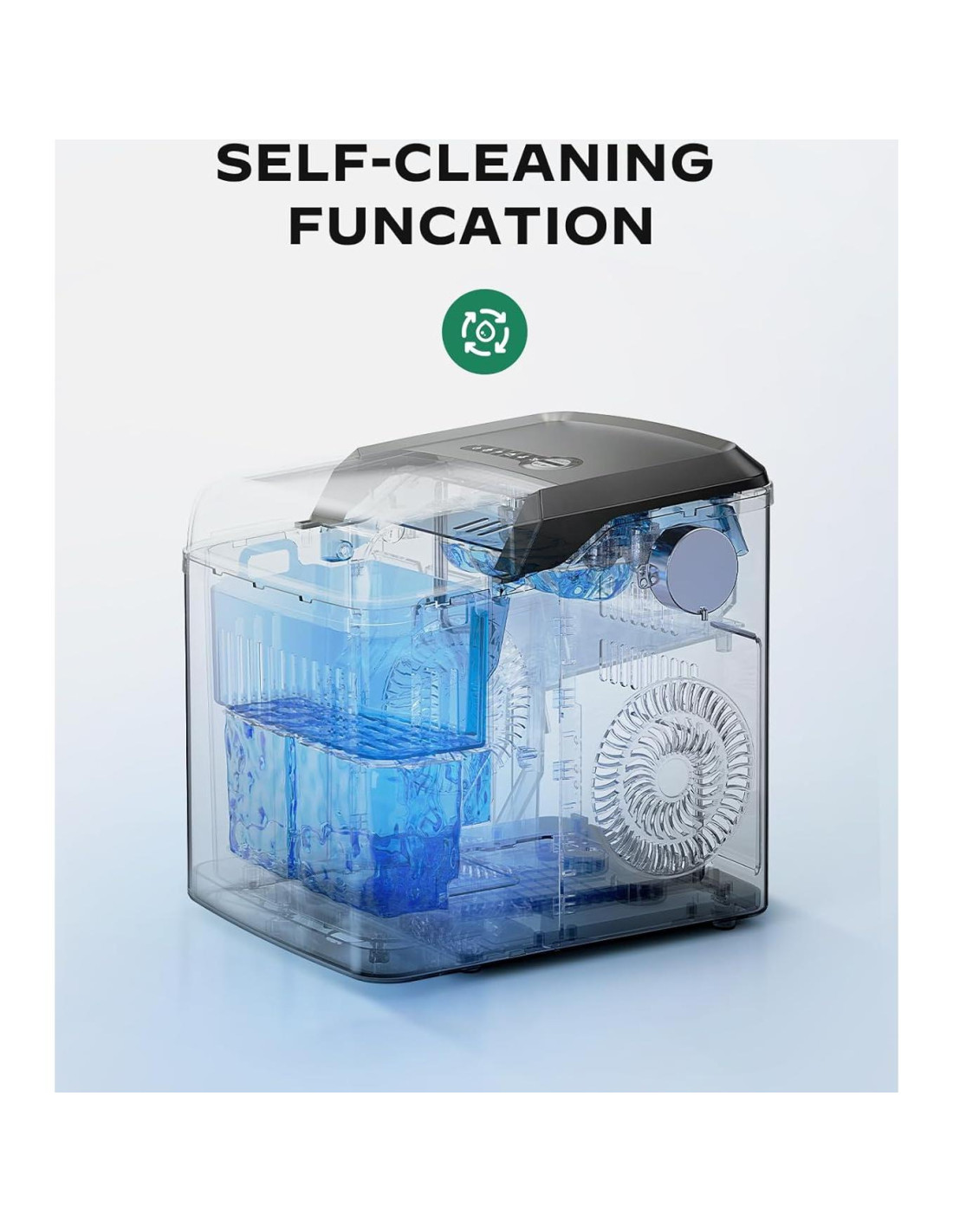 - Función de Autolimpieza: Mantén tu hielo con un sabor fresco utilizando la función de autolimpieza. Simplemente retira la canasta, agrega agua, luego mantén presionado el botón de Selección para elegir el modo de autolimpieza. Presiona el botón de Encendido/Apagado para iniciar el proceso de 5 minutos, luego drena la máquina de hielo sobre un fregadero para completar.