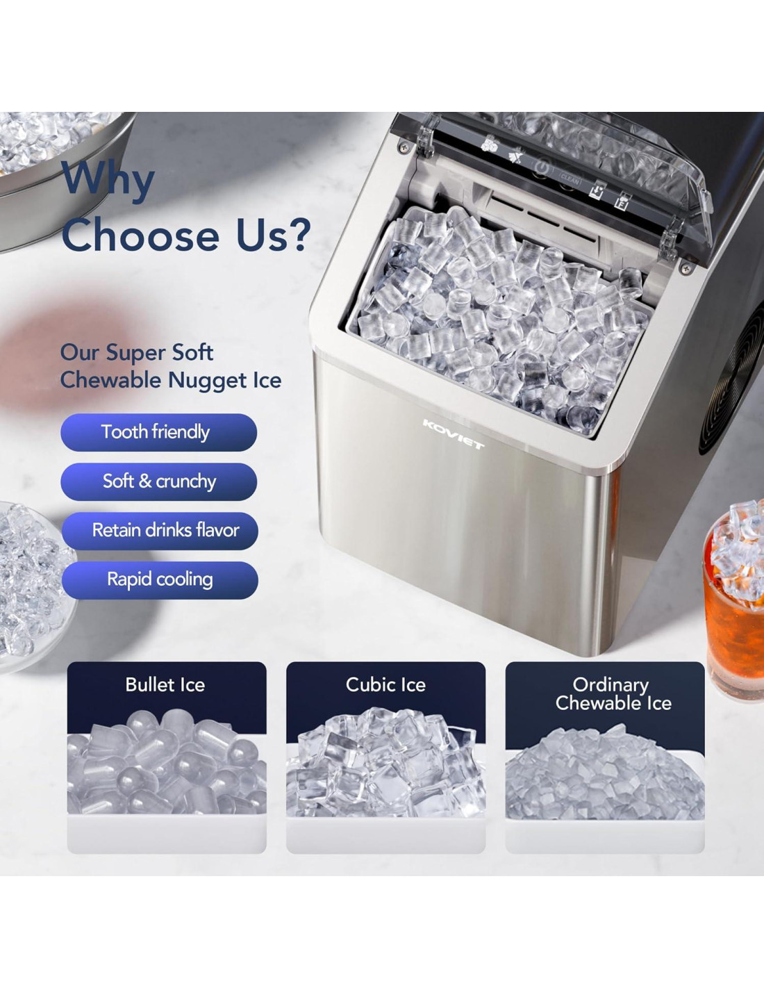 - Hielo Nugget Suave y Crujiente Sin Fin: Producción eficiente de 42lbs (19,05 kg) de hielo nugget fresco por día, a diferencia de los cubos tradicionales, el hielo nugget crujiente y suave es amigable con los dientes, mantiene el sabor de las bebidas y enfría las bebidas rápidamente, perfecto para tus bebidas favoritas