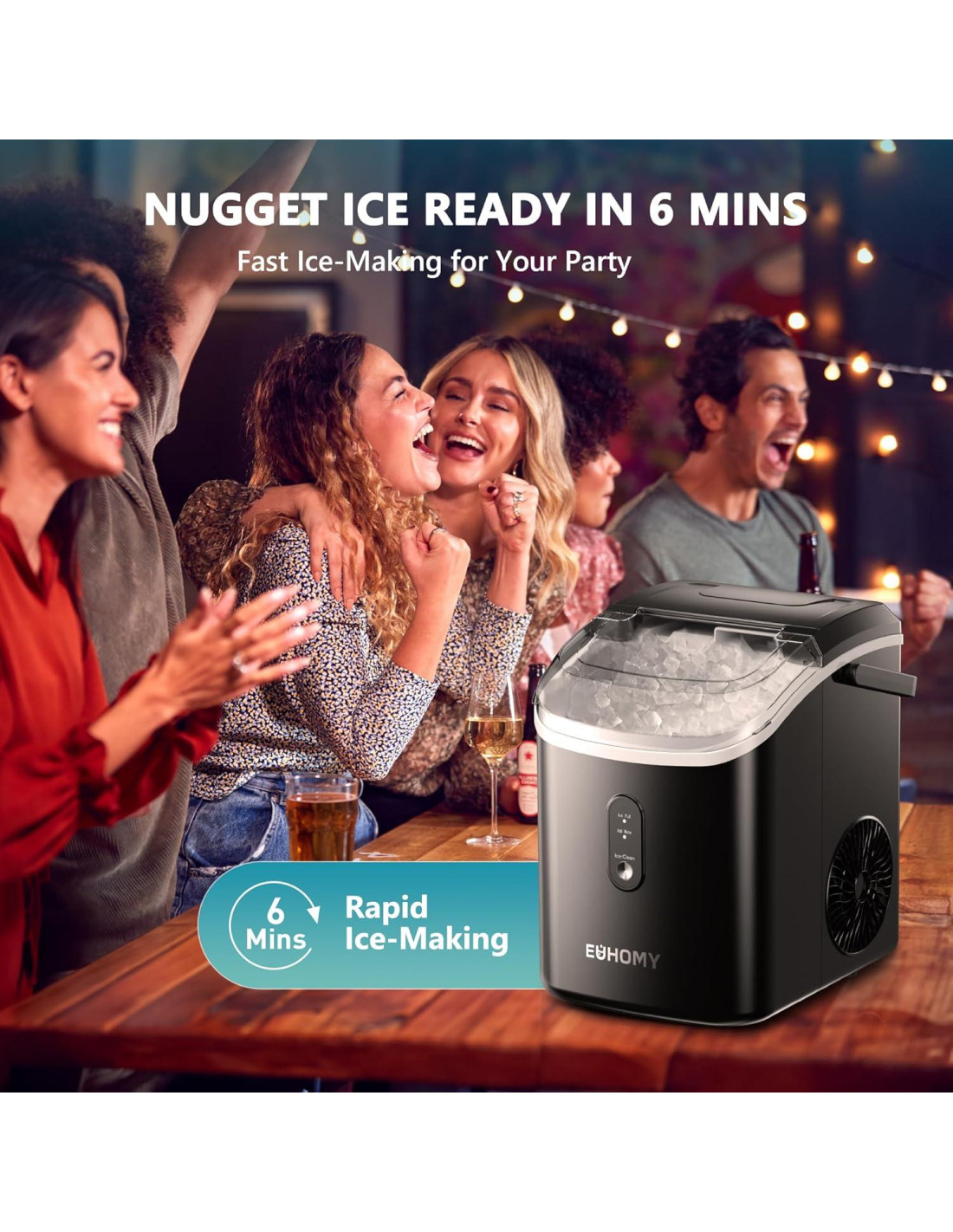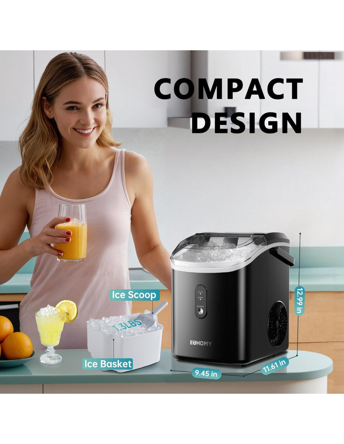 - 6 MINUTOS DE FABRICACIÓN DE HIELO & HIELO TIPO NUGGET: ¡Sacia tu sed rápidamente con el eficiente fabricante de hielo tipo nugget EUHOMY! Puedes disfrutar de hielo sonic fresco y bebidas frías en 6 a 8 minutos. Con un tanque de agua de 1.2Qt, produce fácilmente hasta 15.88 kg de hielo diariamente y tiene una canasta removible de 0.82 kg. El hielo en pellet único y crujiente no lastimará tus manos ni tu boca y enfría las bebidas rápidamente mientras retiene su sabor, proporcionando una experiencia masticable placentera. Es perfecto para enfriar café, batidos y picar hielo como un bocadillo