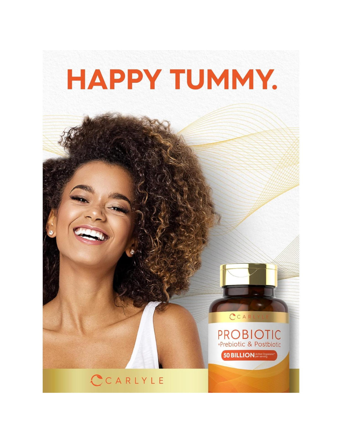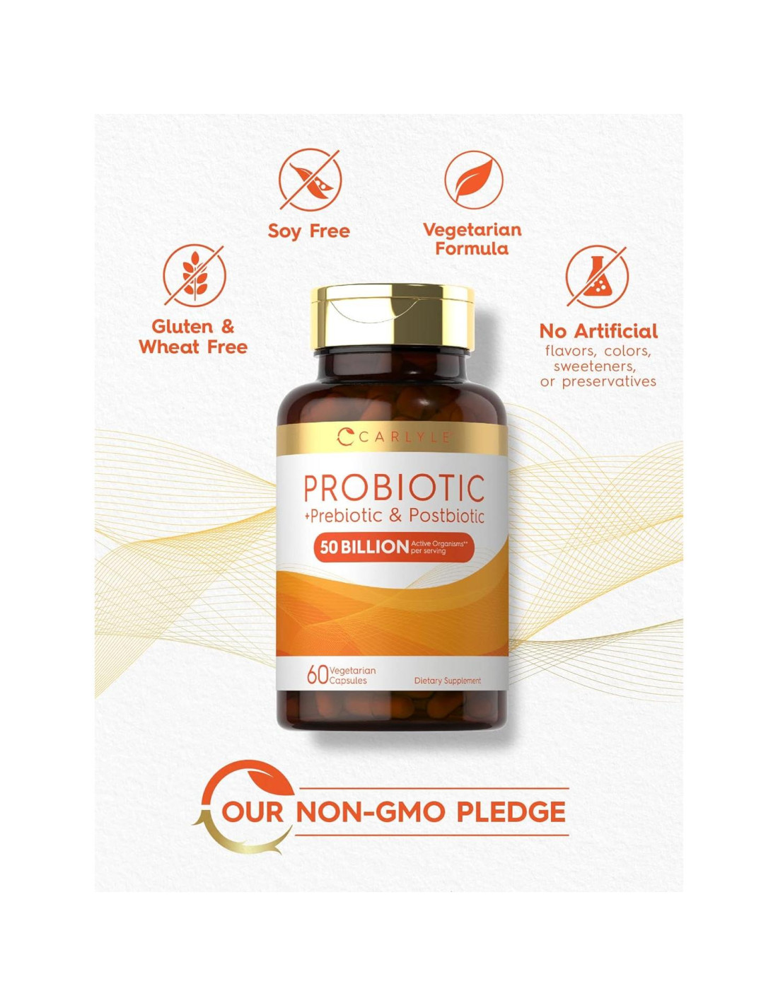 En Carlyle, nuestras raíces son profundas con más de 40 años de experiencia en salud y bienestar. Tres generaciones después, nuestra familia está comprometida a proporcionar productos de calidad en los que puedes confiar. Nuestra experiencia en la obtención de los ingredientes más puros combinada con tecnologías avanzadas nos enorgullece ofrecer suplementos premium y honestos al mejor valor. Estamos dedicados a apoyarte y gracias por elegirnos en tu búsqueda de una vida saludable. Ingredientes Confiables y Calidad Superior. Nuestras raíces en la industria de suplementos comenzaron en 1971, con solo un padre y un hijo. Tres generaciones y tres negocios exitosos después, te traemos Carlyle. Nuestra empresa se basa en la experiencia, el trabajo duro y el crecimiento. Contamos con un equipo dedicado que aporta más de 40 años de experiencia en la creación de vitaminas, minerales y suplementos herbales. No es suficiente para nosotros proporcionarte suplementos de alta calidad a bajo costo, queremos apuntar más alto. Queremos brindarte la mejor experiencia posible. Tu microbioma intestinal, o flora intestinal, consiste en una amplia variedad de bacterias. Hábitos nutricionales sólidos pueden ayudar a apoyar y mantener el equilibrio de estas bacterias amigables. Las fuentes de alimentos probióticos más abundantes incluyen yogur, tempeh y bebidas como kombucha y kéfir. Sin embargo, ahora puedes recibir apoyo diario de Probiótico, Prebiótico y Postbiótico con píldoras, polvo, tabletas masticables, gomitas, líquido, píldoras, cápsulas y geles blandos. ¡Experimenta el suplemento de acción triple de Carlyle! Probiótico + Prebiótico y Postbiótico presenta 142 mg de una Mezcla Propietaria de Probiótico-Postbiótico (que contiene 50 mil millones de organismos activos** más 200 mg de Inulina Orgánica (Prebiótico)) por porción. Nuestra fórmula vegetariana todo en uno es sin gluten y no OGM, hecha sin edulcorantes o conservantes artificiales, lo que la convierte en una opción perfecta para hombres y mujeres adultos en todas partes. Nuestra experiencia en la obtención de los ingredientes más puros combinada con tecnologías avanzadas nos enorgullece ofrecer suplementos premium y honestos al mejor valor. Nuestro Probiótico + Prebiótico y Postbiótico es un testimonio de nuestro compromiso con la excelencia, hecho con ingredientes poderosos arraigados en el bienestar. Gracias por elegirnos en tu búsqueda de vivir saludablemente. **Carlyle Probiótico + Prebiótico y Postbiótico contiene más de 50 mil millones de organismos activos por porción (incluyendo los productos metabólicos naturalmente ocurridos). ADVERTENCIA: Si estás embarazada, amamantando, tomando algún medicamento o tienes alguna condición médica, consulta a tu médico antes de usar. Si ocurren reacciones adversas, deja de usar este producto inmediatamente y consulta a tu médico. Si el sello debajo de la tapa está dañado o falta, no lo uses. Mantener fuera del alcance de los niños. Almacenar el envase sin abrir en un lugar fresco y seco. Refrigerar después de abrir.