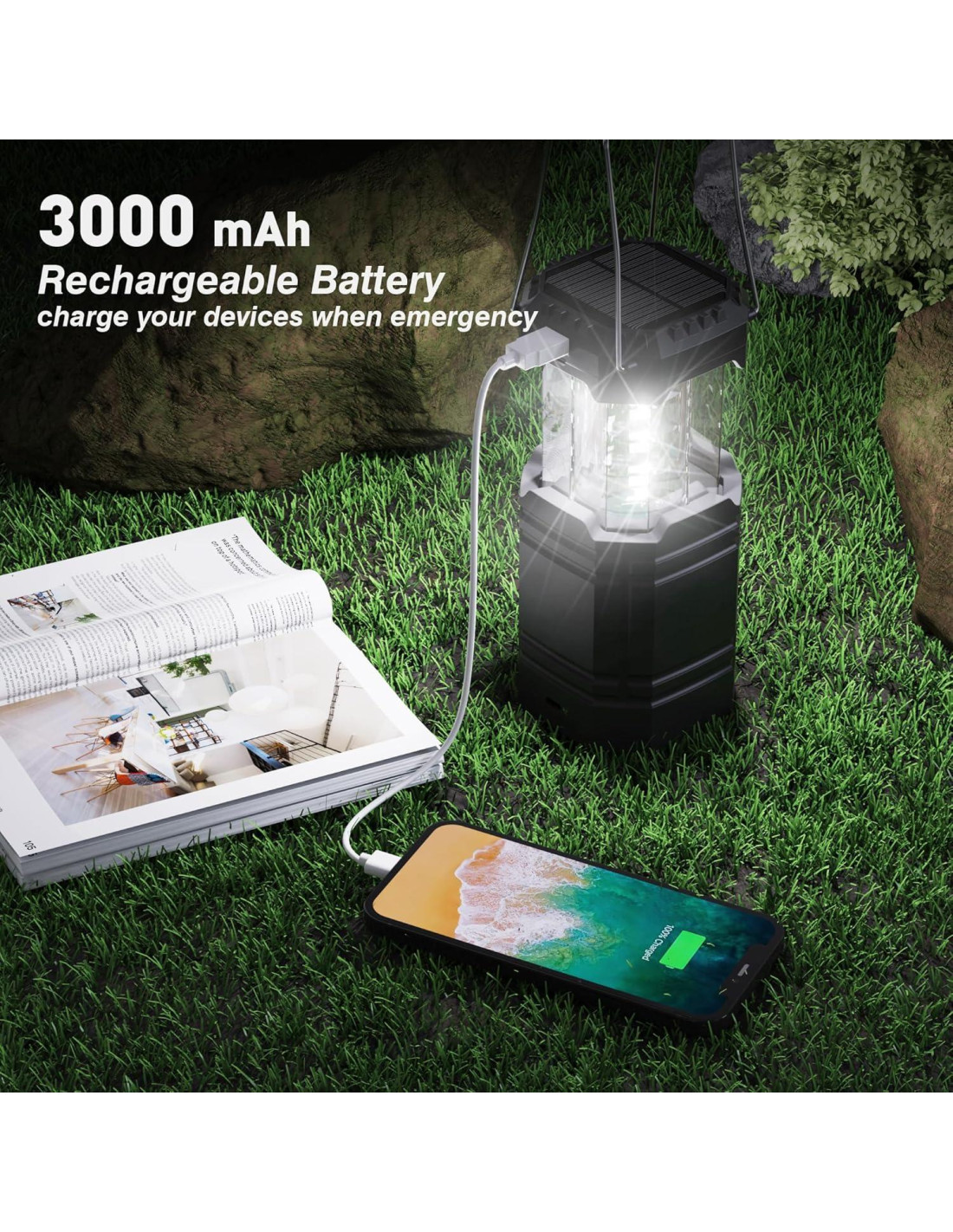 - Componentes incluidos: 1 x Linterna de Camping, 1 x Cable de Carga USB, 1 x Manual del Usuario