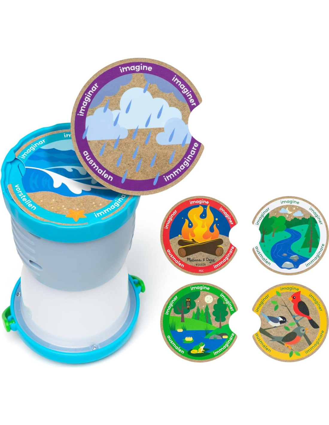 Explora los paisajes y sonidos de acampar en diferentes hábitats con este ingenioso set de juego de linterna de camping que combina diferentes opciones de iluminación de colores con sonidos de la naturaleza. Gira el dial en la Linterna de Luz y Sonido Vamos a Explorar para elegir el color de la luz, luego presiona para crear un paisaje sonoro correspondiente (pájaros, bosque con búho, crepitante fogata, olas del océano, arroyo fluyendo, lluvia con trueno distante). Los sonidos se reproducen en un bucle durante hasta 30 minutos, o presiona nuevamente para jugar en silencio. Las tarjetas de doble cara encajan en la base de la linterna y ayudan a ambientar la narración. Vamos a Explorar anima a los niños a conectarse con el mundo natural a través del juego imaginativo. Descubre la alegría de las aventuras al aire libre que fomentan la curiosidad y la confianza mientras inspiran a los niños a decir, 'Vamos a Explorar'. Se requieren 3 baterías AA, no incluidas.