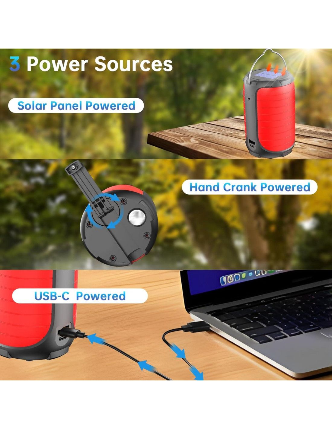 - Batería Recargable y Larga Duración: La linterna de camping es alimentada por una batería de litio recargable de 5000mAh incorporada, que se puede recargar a través de USB-C, solar, manivela. La batería tiene una larga vida útil y puede proporcionar hasta 48 horas de iluminación con una sola carga, dependiendo del modo que uses, lo que la hace ideal para cortes de energía, kits de supervivencia y otros usos al aire libre e interiores.