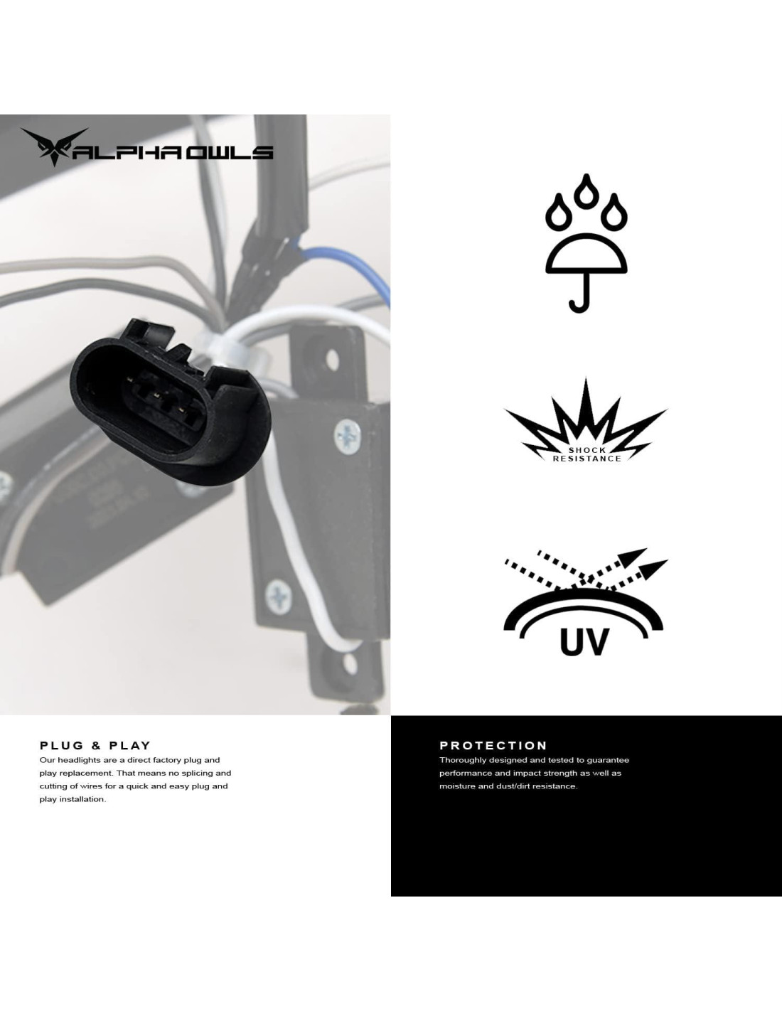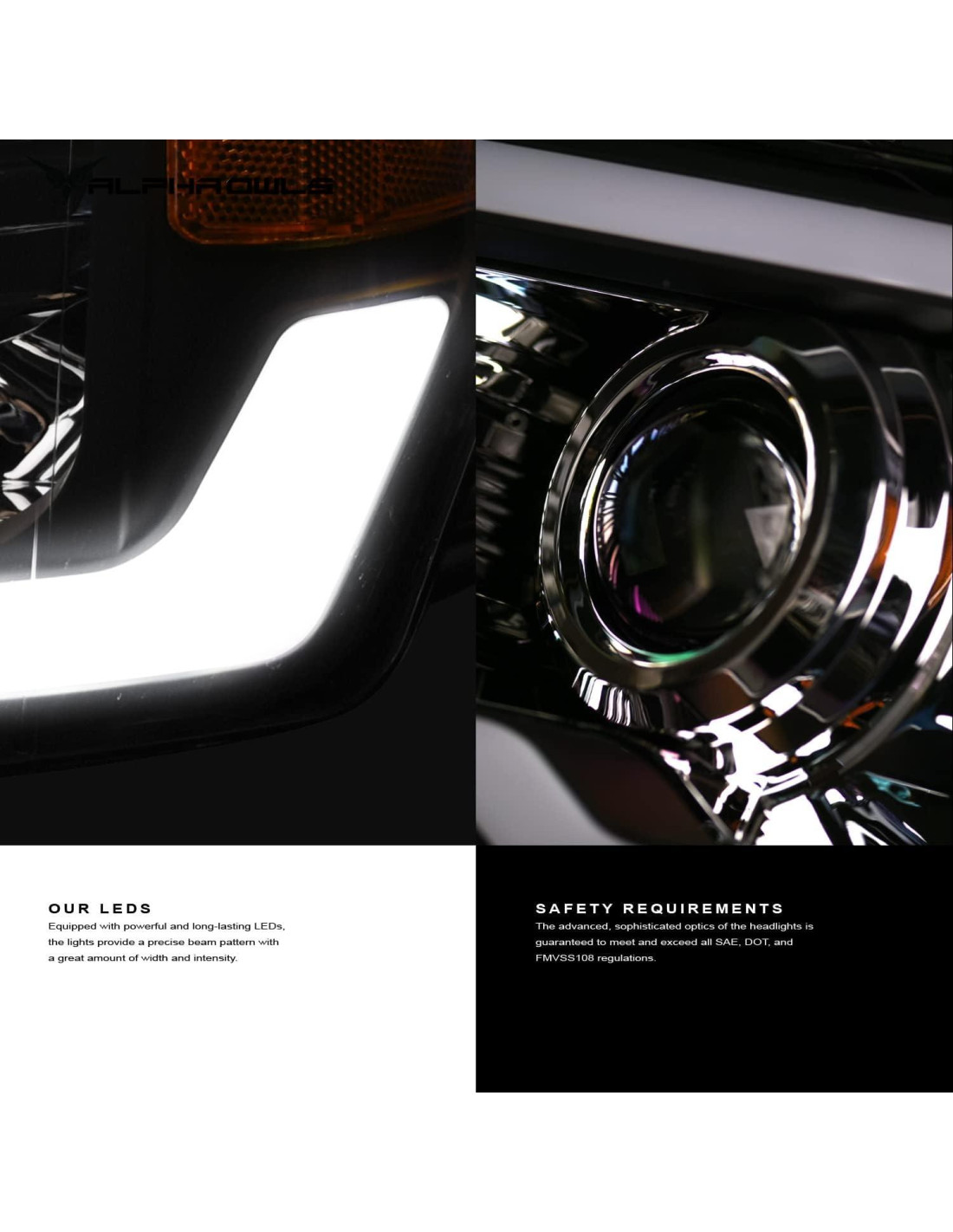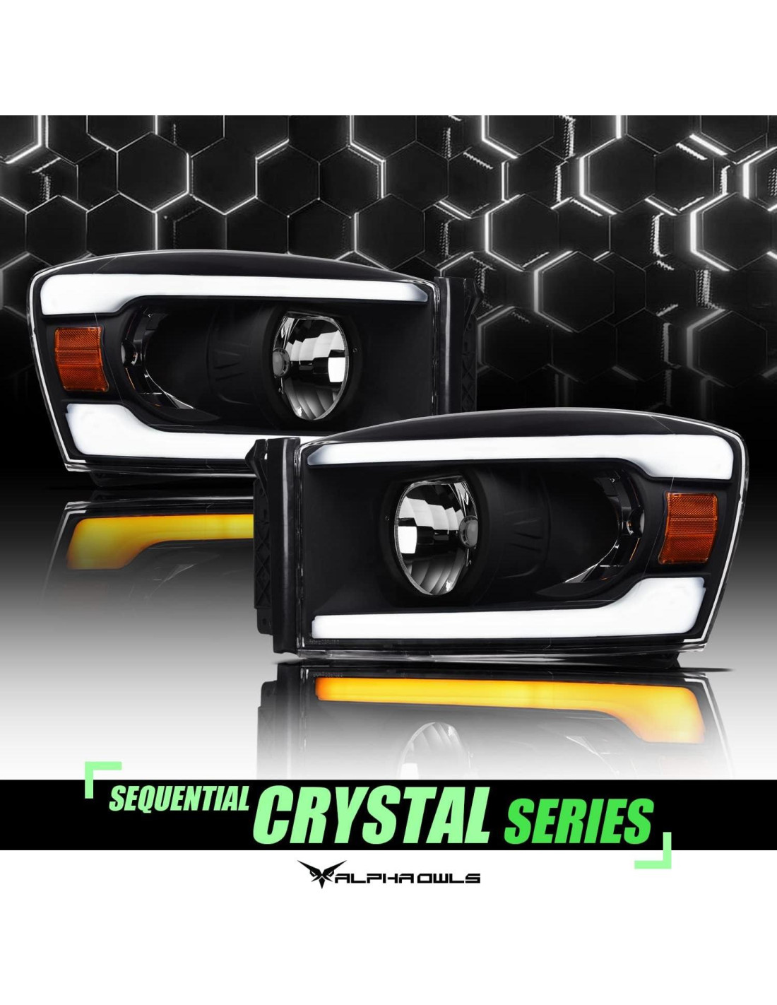 - Modelo: Alpha Owls 8712085 Faros de Cristal Con Barra de Luz LED Secuencial y Luz de Inicio - Negro Ámbar