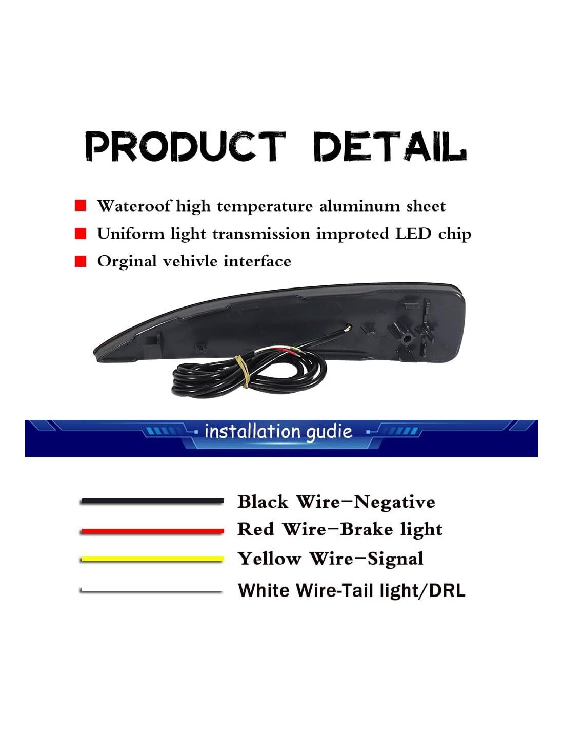 - Fácil instalación: Conectar el cable negro al negativo de la luz de freno, el cable blanco al positivo de las luces traseras, el cable amarillo al positivo de la luz de señal y el cable rojo al positivo de la luz de freno.