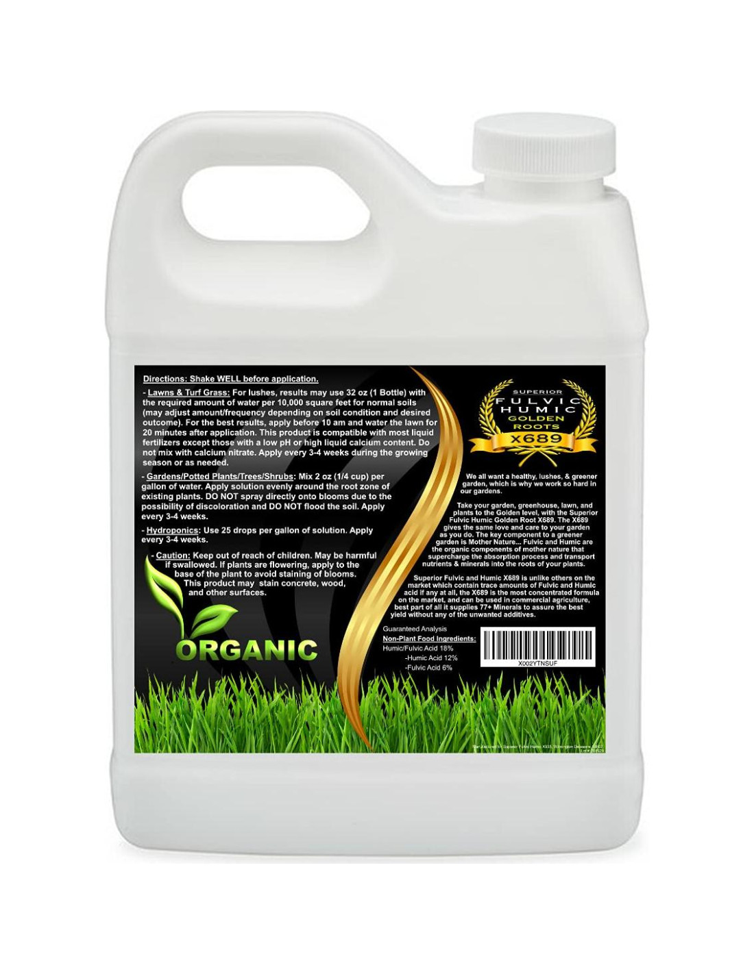 Al igual que nuestros cuerpos requieren nutrientes para funcionar de manera óptima, las plantas y los céspedes tienen requisitos similares. El potasio, el fósforo y el nitrógeno trabajan juntos para fortalecer las plantas. Ya sea que estés usando una forma líquida de fertilizante para césped o sólidos secos, un fertilizante de buena calidad debe contener todos estos nutrientes en niveles óptimos. Tu fertilizante proporcionará a tus plantas los nutrientes que requieren; sin embargo, no todos los nutrientes se absorberán de manera efectiva, y como resultado, es posible que no veas los beneficios óptimos del fertilizante. Afortunadamente, el ácido fúlvico y el ácido húmico con más de 77 minerales contenidos en las Raíces Doradas superarán este obstáculo. El ácido húmico y el ácido fúlvico airean el suelo, mejorando la absorción de carbono y nutrientes de las plantas, y trabajan sinérgicamente con los fertilizantes, creando céspedes más felices y verdes. Lo último que quieres hacer es tomar todos los pasos necesarios y aliviar el secreto oculto de la madre naturaleza. El ácido fúlvico y el ácido húmico son componentes orgánicos de la madre naturaleza y son la clave para un césped más verde. Al aplicar las Raíces Doradas X689, todos los nutrientes del suelo y el fertilizante mejorarán y se transportarán a las raíces de las plantas, creando un hermoso jardín del cual estarás orgulloso de mantener. El X689 es la forma líquida más concentrada de ácido húmico y ácido fúlvico disponible en el mercado; es tres veces más concentrado que cualquier otro producto disponible, lo que te permite usar una menor cantidad y seguir siendo más efectivo. La mezcla se puede aplicar en todas las etapas del proceso de jardinería y plantación, especialmente para mantener el verdor de todos tus esfuerzos diligentes. Dado que la mezcla de ácido fúlvico y húmico es una mezcla potente, funciona mucho más rápido que los sólidos granulares. La mezcla necesitará ser diluida ya que es super concentrada y utilizada de acuerdo con las instrucciones. ¿Tu césped tiene problemas para desarrollarse en ciertos lugares? El X689 ayuda a retener la humedad, haciendo que el suelo sea más suave y tu césped más grueso, saludable y vibrante. Puedes usar el Concentrado de Húmico en conjunto con fertilizantes para obtener los mejores resultados. Con el suelo reteniendo más humedad y los nutrientes transportándose a las raíces, con el tiempo, esto permite un engrosamiento del césped en los lugares más delgados. Si tu césped es de color marrón o verde claro, el concentrado de ácido húmico y fúlvico puede ayudar a que luzca saludable y de un verde oscuro y rico en color. Ahora, ¿quién no quiere el césped más verde del vecindario? Los componentes finales de la descomposición natural de plantas y animales son los ácidos húmicos y fúlvicos. El ácido húmico es una clase de moléculas que se unen y ayudan a las raíces de las plantas a obtener agua y nutrientes. Un alto nivel de ácido húmico puede aumentar significativamente los rendimientos. Una deficiencia de ácido húmico puede obstaculizar la capacidad de los agricultores y jardineros para cultivar cultivos que proporcionen la mejor nutrición. Estos ácidos orgánicos son los últimos componentes de la descomposición natural en material vegetal y animal encontrado en depósitos prehistóricos. El ácido fúlvico es una sustancia húmica de color marrón amarillento que es soluble en agua a todos los niveles de pH y tiene una baja masa molecular. El ácido húmico: es soluble en agua a un pH del suelo más alto con una apariencia de sustancia húmica de color marrón oscuro y tiene un peso molecular mayor que el ácido fúlvico. El ácido húmico puede permanecer en el suelo durante muchos siglos si no se altera. El humin es un material húmico negro que es insoluble en agua a cualquier pH y tiene una alta masa molecular. ¿Cómo funciona el ácido húmico? Al usar las Raíces Doradas, todos los nutrientes del suelo y el fertilizante se mejorarán y transportarán al césped, creando un hermoso césped del cual estarás orgulloso. Esta mezcla concentrada se puede aplicar en todas las etapas del proceso de jardinería y plantación. Dado que la mezcla de ácido fúlvico y húmico es un concentrado potente, necesitarás diluir la mezcla y usarla de acuerdo con las instrucciones. ¿Quieres un césped más verde y saludable? Si es así, asegúrate de agregar las Raíces Doradas X689 a tu jardín. El ácido húmico y fúlvico líquido mejorará el crecimiento de las raíces, la retención de agua y añadirá materia orgánica beneficiosa a todos los tipos de césped, jardines, plantas, césped, plantas en macetas, plantas de interior, tomates y plantas de verduras. ¡Condiciona y trata el suelo de manera orgánica!
