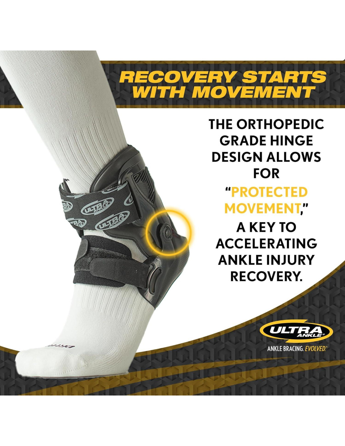 - LA RECUPERACIÓN COMIENZA con MOVIMIENTO PROTEGIDO. El diseño de bisagra de grado ortopédico permite un movimiento natural hacia arriba y hacia abajo del tobillo para recuperar el rango de movimiento y la fuerza muscular perdidos, lo que acelera significativamente la curación y la recuperación.