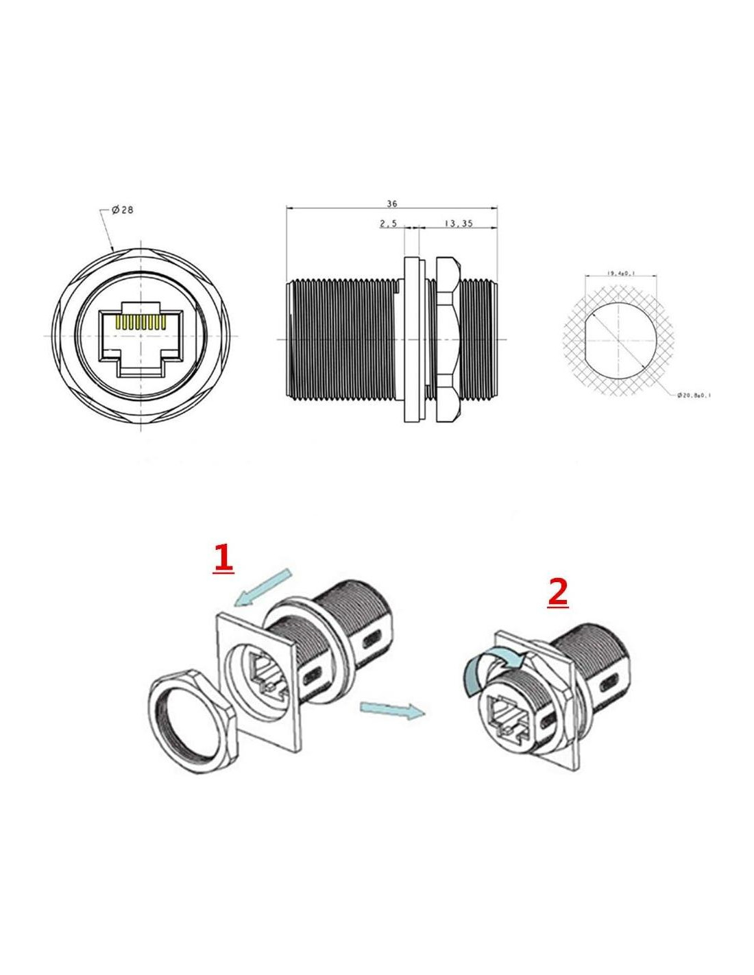 El montaje en panel industrial blindado es un conector de cable LAN Ethernet a prueba de agua. Utilizando el sistema de conexión RJ45 basado en estándares, se asegura la compatibilidad con el hardware existente. El acoplador blindado mantiene la continuidad del blindaje ofreciendo protección contra interferencias EMI/RFI. Especificaciones: Color: Negro CNBTR Material: Plástico + Metal Puerto de conexión: RJ45 Núcleo del cable: 8 Pines: 8P8C Voltaje de resistencia (AC.V) 1min: 1000V Resistencia de contacto: menos de 30mV Resistencia de aislamiento: más de 500M Durabilidad: más de 500 ciclos de acoplamiento y desacoplamiento Partes aisladas: Plásticos de ingeniería de alto rendimiento Metal hardware: Aleación de zinc (cromo duro perlado) Pin de contacto: Aleación de cobre (chapado en oro) Temperatura de trabajo: -40C-105C Longitud total: aproximadamente 36mm (1.42 pulgadas) Grosor del panel de montaje: 1.5~10mm (no incluido) Tamaño del agujero: 20.8mm Paquete incluido: 1x Conector RJ45 a prueba de agua