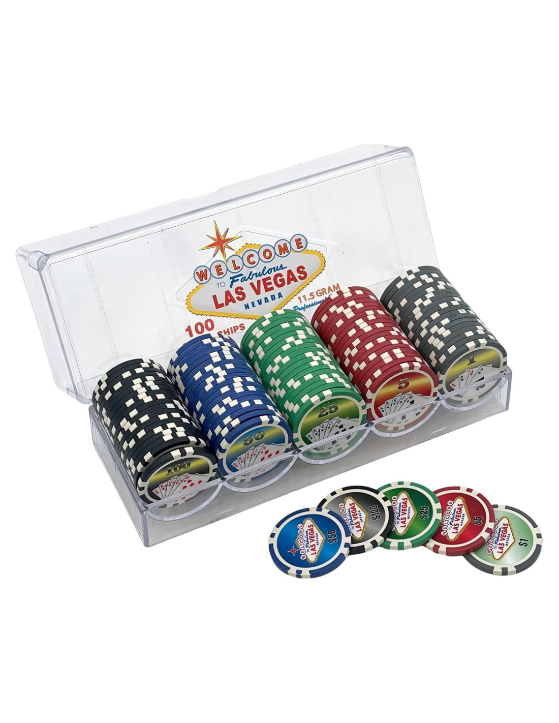 Esta hermosa bandeja plástica transparente con 100 piezas de fichas de póker diseño "Las Vegas" tiene los mejores detalles y la más alta calidad que encontrarás en cualquier lugar. Las 100 piezas de fichas de póker diseño "Las Vegas" en bandeja plástica transparente son verdaderamente notables. Detalles de las 100 piezas de fichas de póker diseño "Las Vegas" en bandeja plástica transparente: Condición: Producto Nuevo SKU: SS-CQG-2715PL-L Dimensiones: H: 2.3 x W: 3.13 x D: 8.3 (pulgadas) Más Información: - 100 piezas de fichas de póker "Las Vegas" en una bandeja plástica con tapa. - Se pueden apilar sobre otra bandeja.