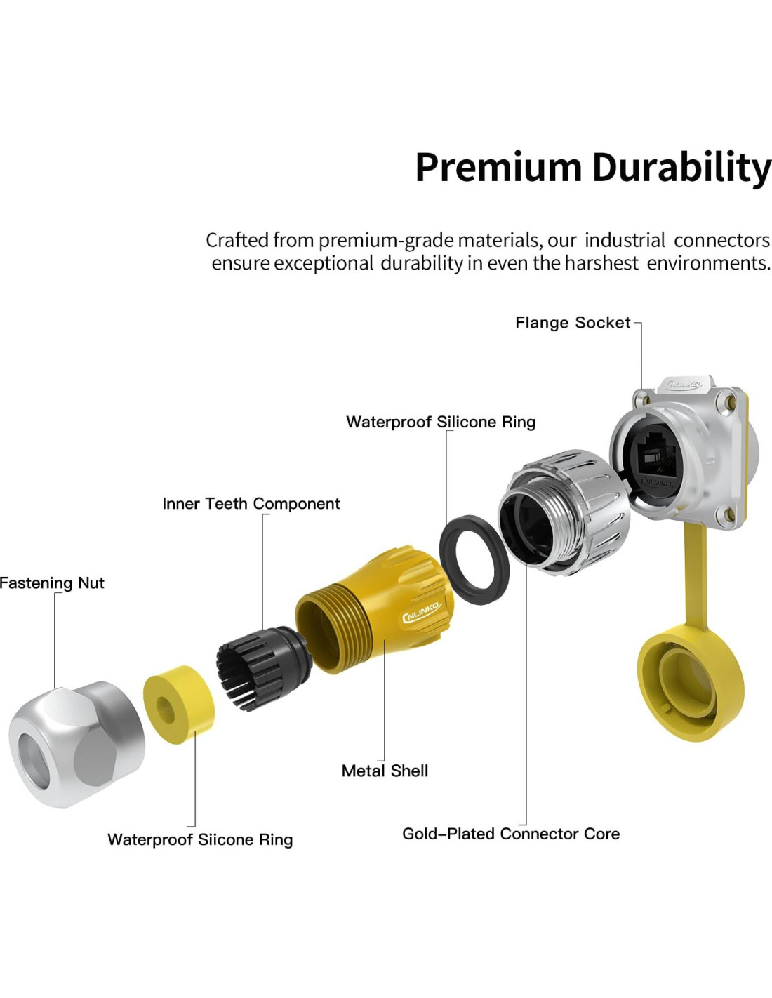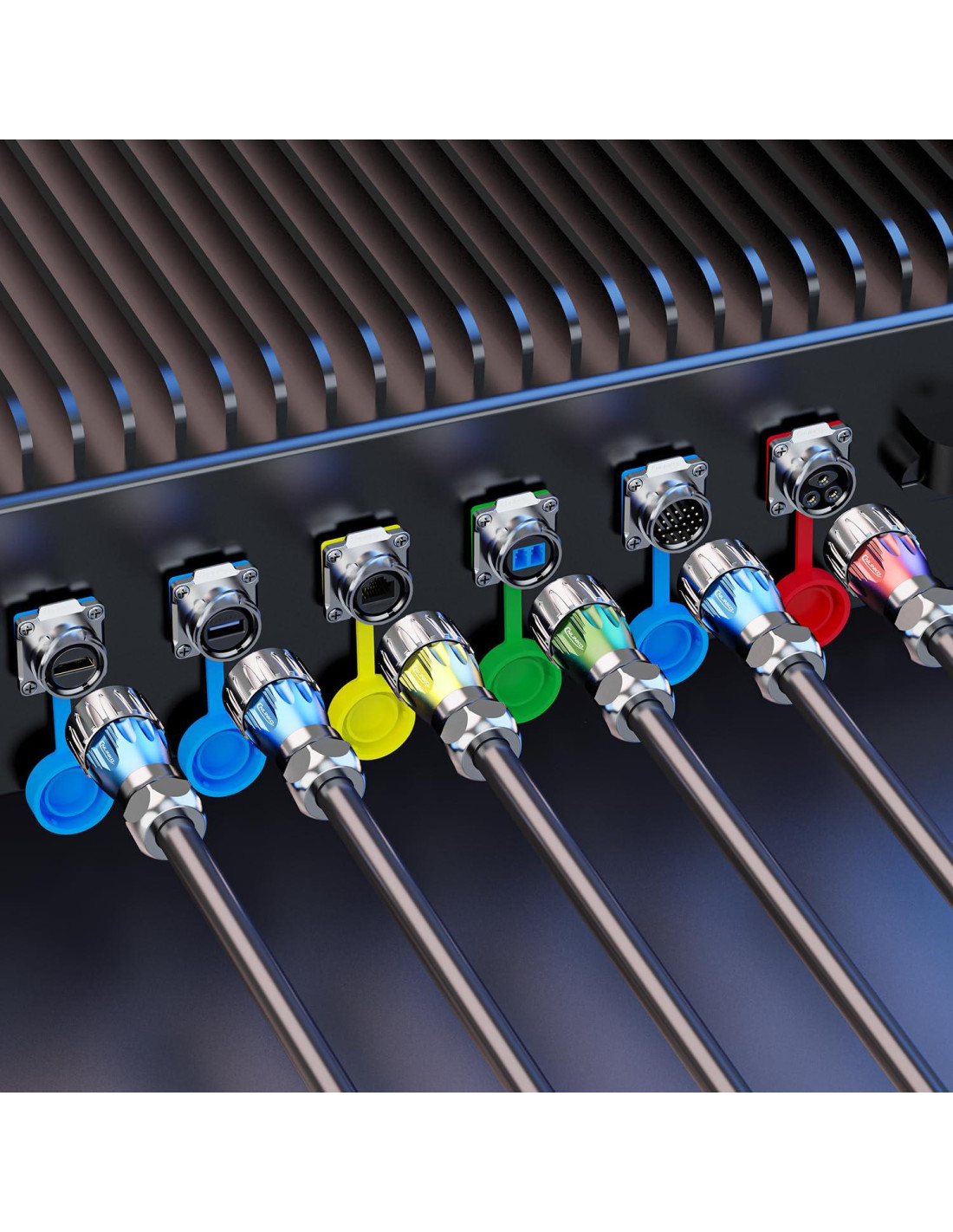 - Juego de Conectores DH24 RJ45: Incluye conector macho RJ45 y receptáculos de montaje en panel RJ45. Diseñado con un mecanismo intuitivo de enchufe/desenchufe que garantiza una experiencia sin complicaciones mientras mantiene una conexión estable. Nivel de Protección: IP68 (Acoplado).