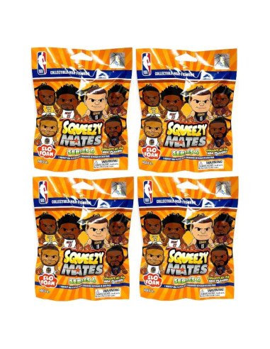 ¡Nueva Serie 4 de Jugadores de la NBA! ¡Aprieta estos juguetes de espuma super suave de tus jugadores favoritos de la NBA! SqueezyMates son figuras de espuma de lento ascenso coleccionables y divertidas de apretar que presentan los nombres, números y la imagen de jugadores profesionales de baloncesto actuales. Dentro de cada paquete sorpresa de SqueezyMates hay una figura de un jugador de la NBA, ¡lista para anotar! La figura del jugador dentro de cada paquete sorpresa es aleatoria, lo que añade misterio y diversión a cada paquete.