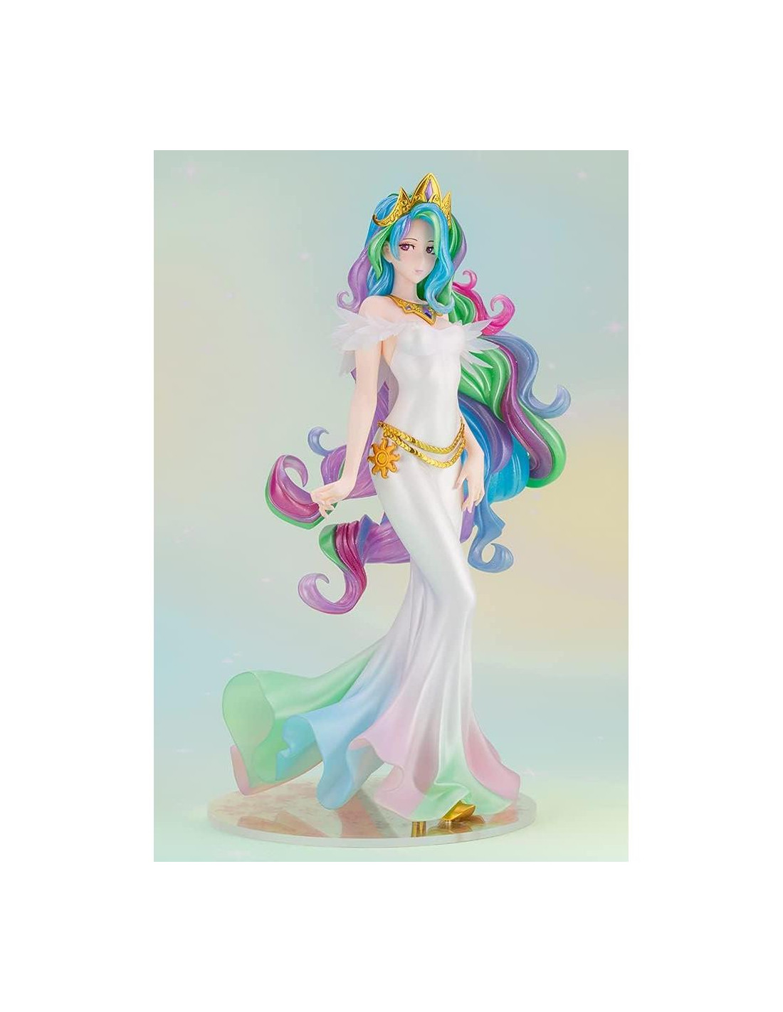 La princesa del sol que gobierna Equestria y mentora de Twilight Sparkle, Princesa Celestia, finalmente se une a la línea estilizada BISHOUJO de My Little Pony. Su vestido presenta un diseño original de Shunya Yamashita y está pintado en suaves colores perlados, y su mística cabellera fluida está hecha de plástico transparente lleno de purpurina y pintada de un color perlado para resaltar una textura suave y delicada. Su versión de pony blanca y brillante está colocada sobre una base separada y puede ser exhibida de forma independiente. El diseño del paquete contrasta bellamente con el de la Princesa Luna [se vende por separado] y también incluye un diseño holográfico. Con tanto cuidado puesto en cada detalle de esta estatua, se convierte en una pieza imprescindible para todos los fanáticos de My Little Pony.