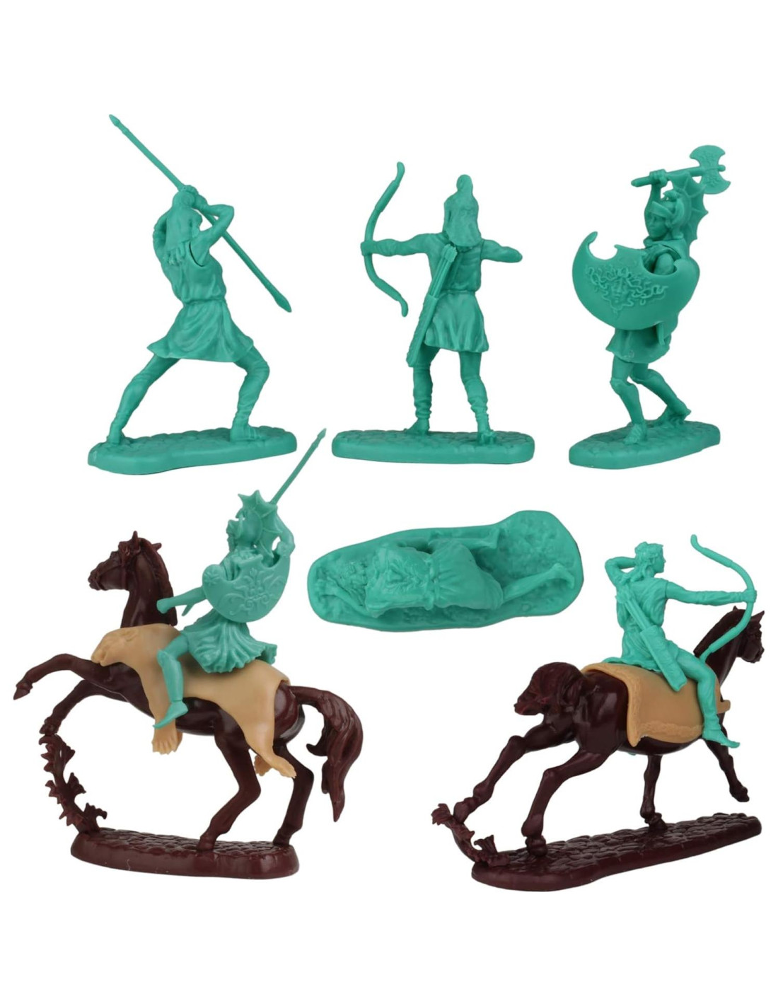 Figuras de soldados de juguete femeninas con más de 3000 años de historia. Las Amazonas de la Guerra de Troya son un conjunto de 15 de LOD Enterprises. El conjunto incluye 12 guerreras amazónicas antiguas de la Era del Bronce en 8 poses que miden hasta 2.5 inches (6,35 cm) de altura y son aproximadamente a escala 1:30. Figuras altamente detalladas y realistas hechas de plástico blando en un color turquesa. LOD Enterprises se compromete a producir figuras con escultura superior, precisión histórica y atención al detalle, pero también con un guiño al pasado para que se mezclen perfectamente con figuras de Atlantic, TSSD, Superior y ToyWay. Consejo de LOD: Para enderezar armas, sumérgelas en agua caliente y luego en agua fría. Empaquetado en una bolsa de polietileno con tarjeta de encabezado y recomendado para mayores de 14 años.