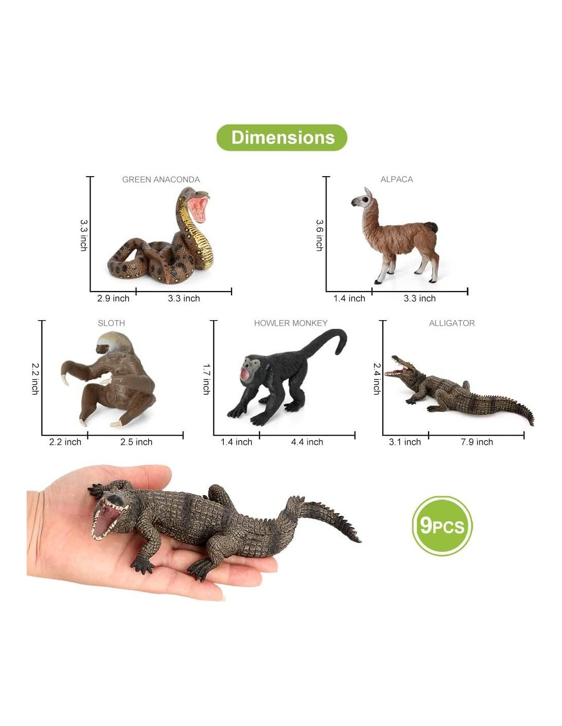 - Set de 9 Figuras de Animales de América del Sur - Cocodrilo, Perezoso, Mono Aullador, Jaguar, Bebé Jaguar, Anaconda Verde, Piraña, Oso Hormiguero, Alpaca.