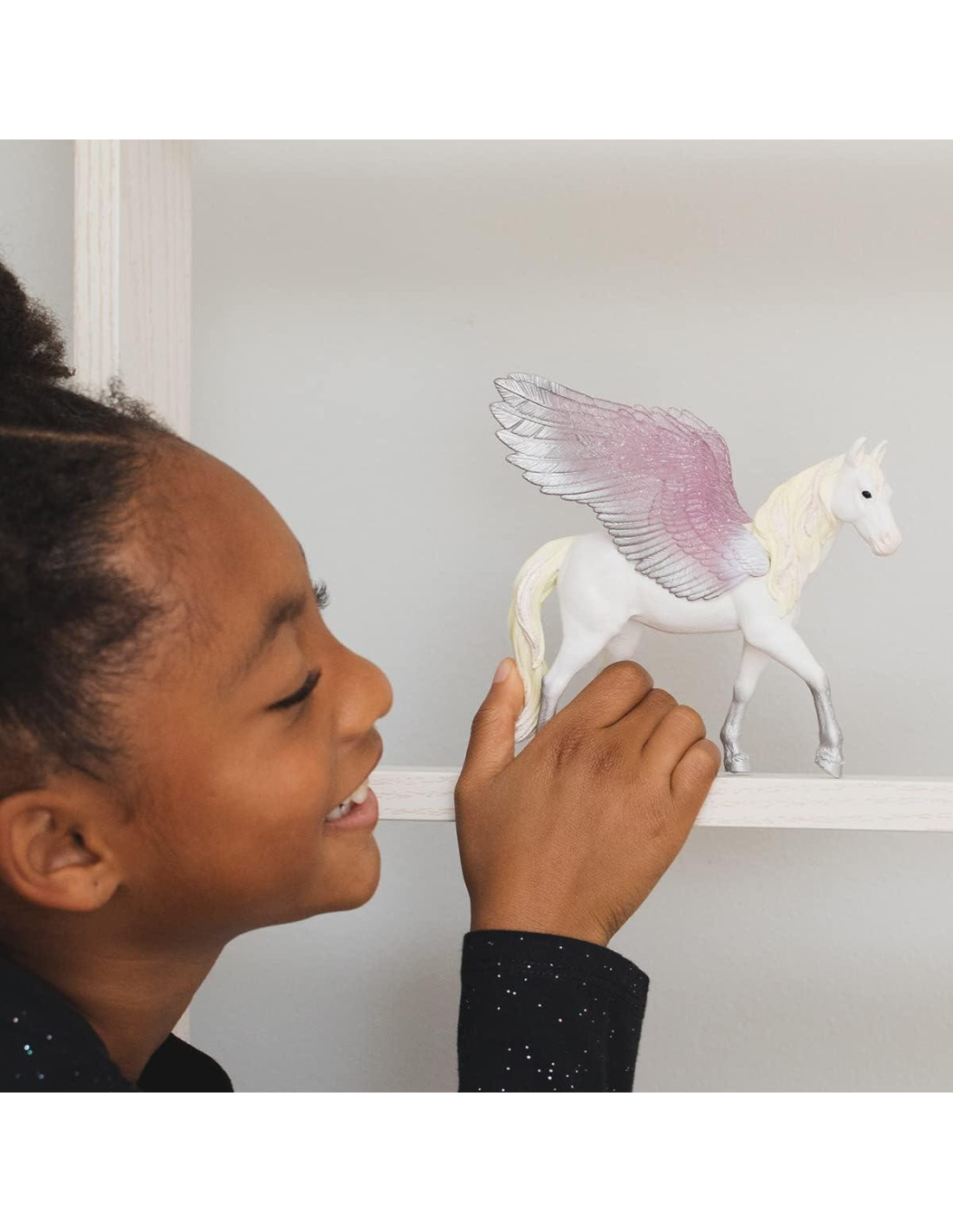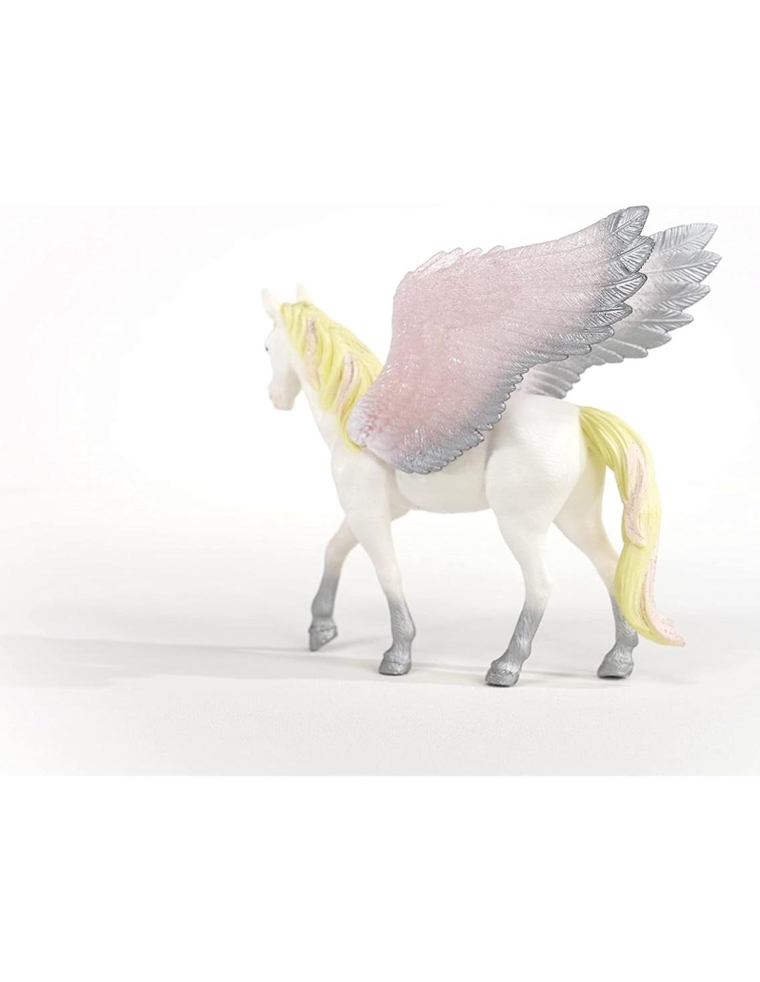 El amanecer en bayala estalla con radiancia cada mañana mientras el Pegaso del Amanecer vuela por los cielos. Tonos de rosa y oro bailan entre las nubes mientras ella despliega sus alas brillantes con puntas plateadas. ¿Qué historias mágicas despertará hoy en la leyenda? Añade un destello de luz solar a tu colección de unicornios con la figura del Pegaso del Amanecer de Schleich bayala - adecuada para niños de 5 años en adelante. A medida que el sol de la mañana entra por tu ventana, la suave luz del sol brilla sobre las alas rosas y plateadas del Pegaso del Amanecer. Te estirás y te darás la vuelta, aún somnoliento. El pegaso despliega sus alas y la luz del sol salpica las paredes de tu dormitorio, salpicándolas con luz brillante y cálida. ¡Despierta, dormilón! ¿Sabías que? Las alas brillantes del Pegaso del Amanecer brillan a la luz de la luna. ¿Crees que el sol y la luna bailarían juntos en una fiesta? Las figuras y conjuntos de juego encantados de Schleich bayala introducen las posibilidades ilimitadas de contar historias y jugar de manera imaginativa. Desde majestuosos búhos y elfos del bosque hasta casas de flores brillantes y establos de unicornios, Schleich bayala deja que tus historias corran libres. Las figuras de criaturas míticas brillan en ricos detalles, mientras que los conjuntos de juego auténticos enriquecen cada relato. ¡Nuestras figuras de juguetes de hadas aman ser llevadas a historias que presentan juguetes de dinosaurios de Schleich, figuras de animales salvajes y caballos de juguete! Los juguetes y conjuntos de juego de criaturas míticas de Schleich están construidos para durar generaciones. Todos nuestros juguetes cumplen con los más altos estándares de seguridad nacionales, internacionales y del reino encantado.