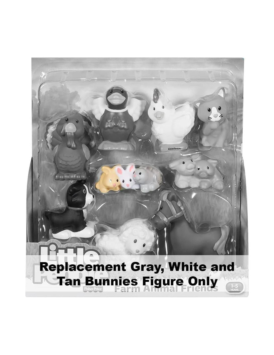 ¿Qué incluye? Figura de Conejos Grises, Blancos y Marrones de Repuesto. Esta figura de Conejos de Repuesto funciona con los Animales de Granja Little People DFN55 de Fisher-Price.