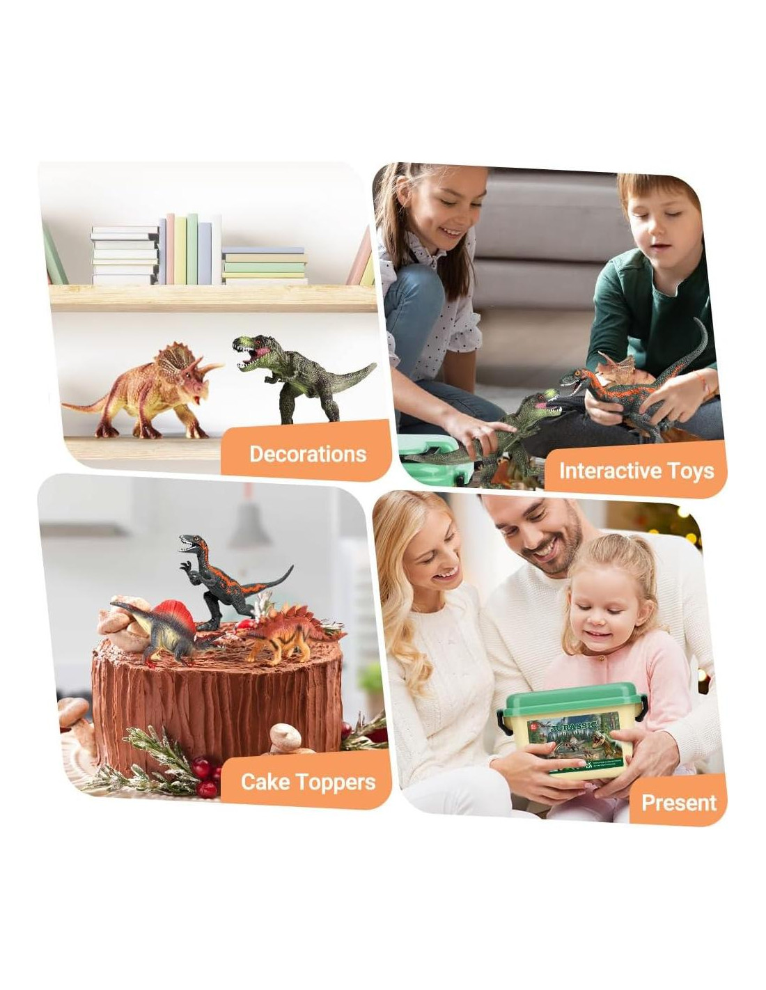 - [Educativo y Diversión Infinita] Los niños pueden usar las figuras de dinosaurios para jugar a roles y juegos de batalla con amigos, y los juguetes de dinosaurios realistas dejarán volar la imaginación de tu bebé. Esto puede mejorar la imaginación de tu hijo, la coordinación mano-ojo y las habilidades lingüísticas. Este conjunto de dinosaurios puede ser utilizado no solo como un juguete y coleccionable para amantes de los dinosaurios, como decoración de toppers de cupcakes, o como un accesorio para un proyecto de ciencia escolar.