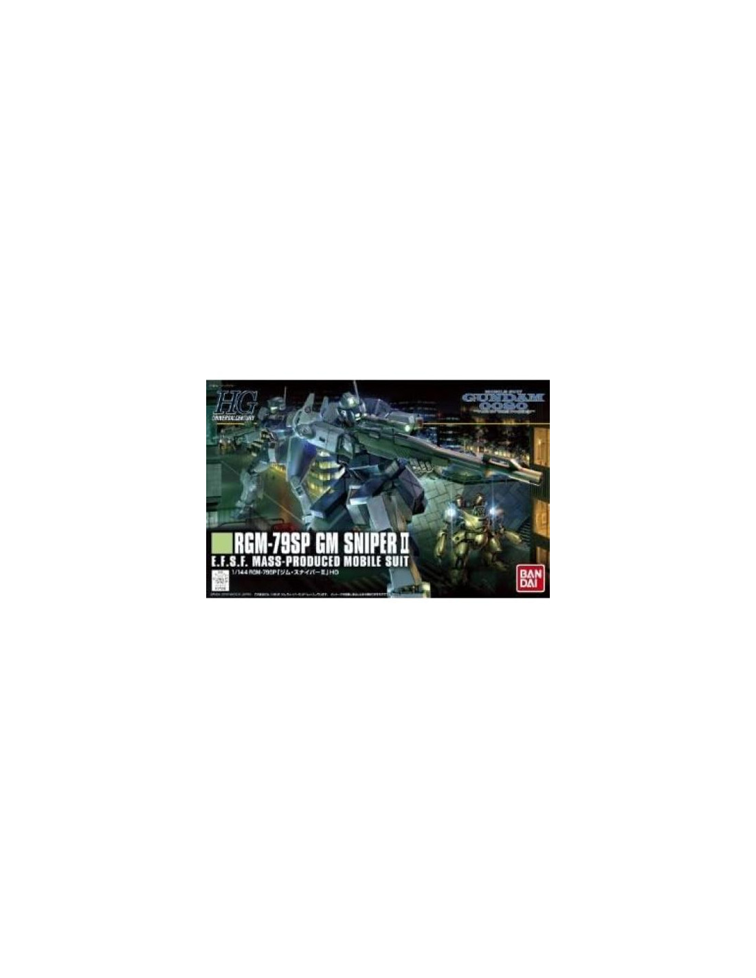 El GM Sniper 2 de la serie OVA Gundam 0080 presenta un rifle de francotirador, ametralladora, sables de energía, escudo y visor abatible para el sensor de la cabeza. También se incluye un traje mini Darken E. Runner x 10, Manual de Instrucciones, pegatinas.