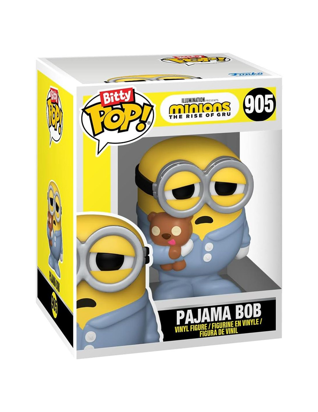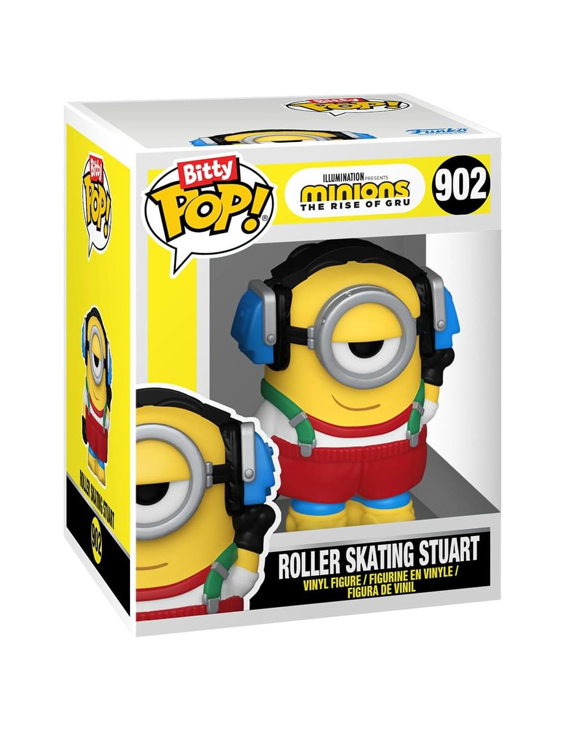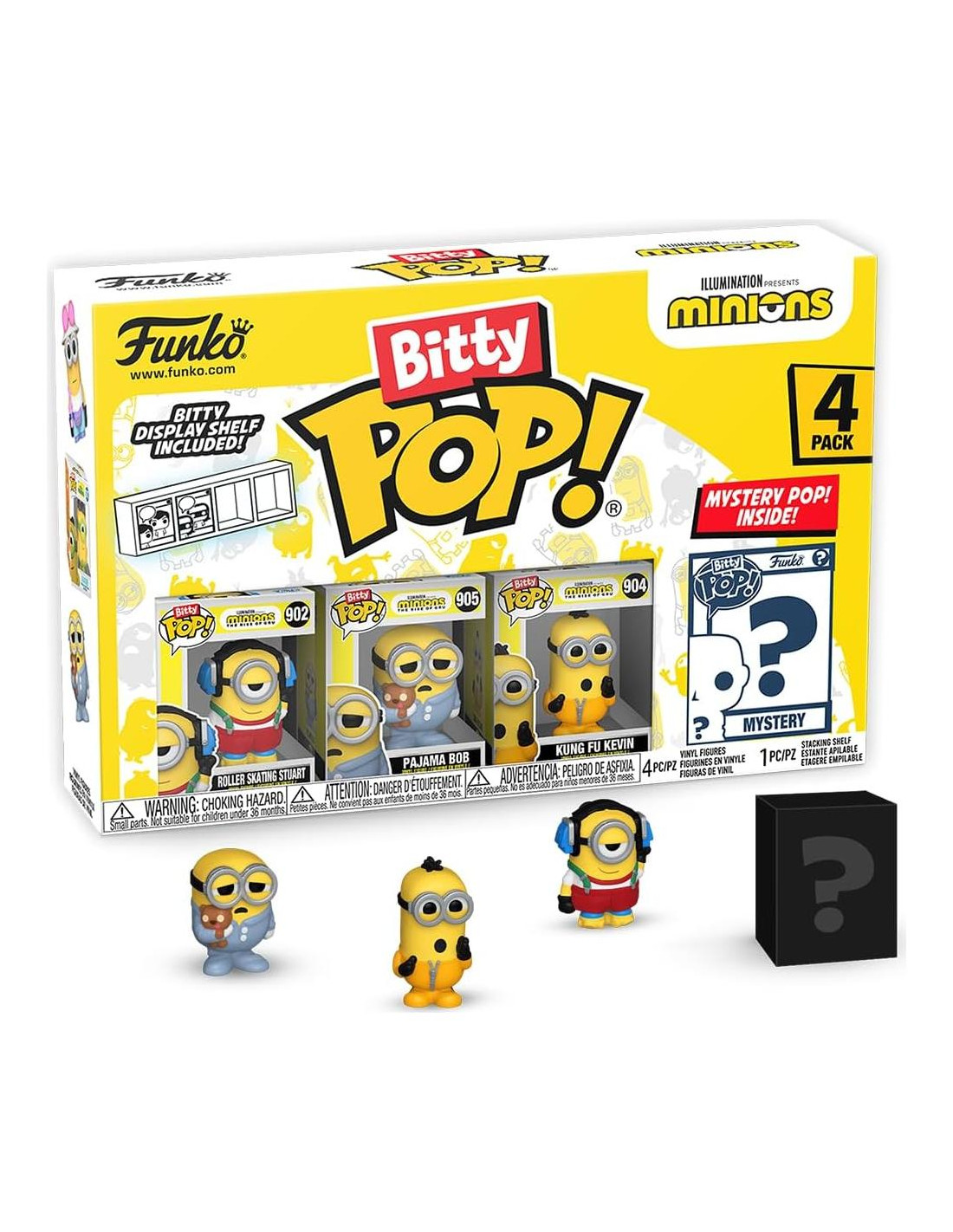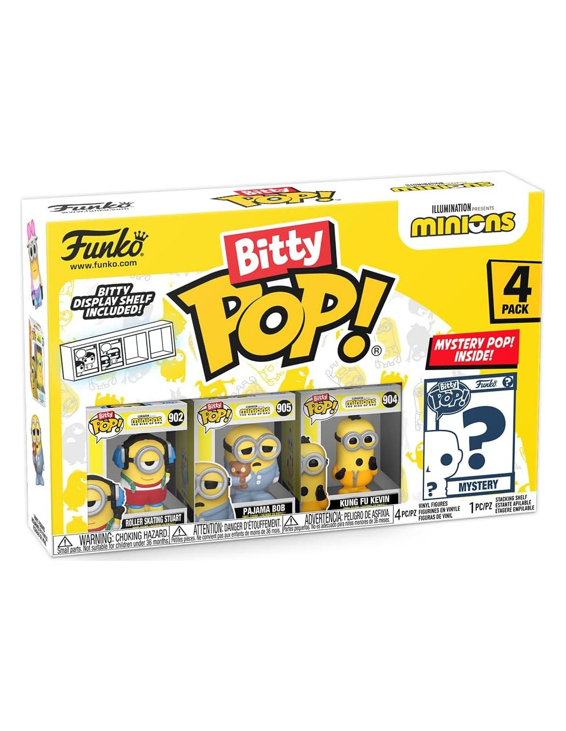 ¡Tus Pops! favoritos han sido reducidos a Bitty Pops! Expande tu colección de Minions con este surtido de figuras Bitty Pop! que presentan a tus malvados minions más queridos. Este paquete de 4 incluye a Bitty Pop! Stuart patinando, Bitty Pop! Bob en pijama, Bitty Pop! Kevin Kung Fu, y una figura Bitty Pop! sorpresa. Las posibles figuras Bitty Pop! sorpresa son el Rey Bob Hyper Rare (1/6), Otto Pet Rock Hyper Rare (1/6), Stuart Mummy Rare (1/3), y Fluffy Rare (1/3). Los Bitty Pops! vienen empaquetados en cajas de acrílico duro con tapas inferiores desmontables. Las tapas inferiores desmontables también sirven como bases de acrílico, a las que se adhieren las figuras Bitty Pop!. ¡Clasifica y organiza tus Bitty Pops! con la caja de exhibición incluida! Las cajas de exhibición de acrílico son apilables y sostienen cuatro figuras Bitty Pop! cada una. Las figuras de vinilo tienen aproximadamente 0.9 pulgadas de altura. Cuatro figuras por compra de paquete individual. Advertencia: Peligro de asfixia. Los coleccionables son pequeños. No apto para niños menores de 3 años. La selección de artículos es aleatoria, ya que cada pieza está en un empaque ciego. No podemos aceptar solicitudes para artículos específicos. Puedes recibir figuras duplicadas.