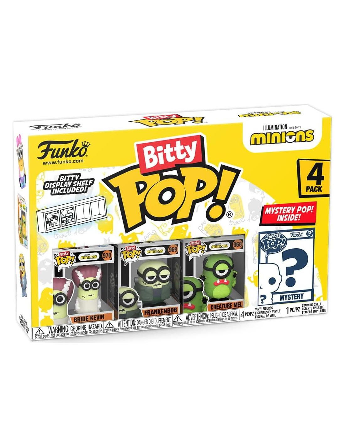 ¡Tus Pops! favoritos han sido reducidos a Bitty Pops! Expande tu colección de Minions con este surtido de figuras Bitty Pop! que presentan a tus malvados minions más queridos. Este paquete de 4 incluye Bitty Pop! Frankenbob, Bitty Pop! Novia Kevin, Bitty Pop! Criatura Mel y una figura Bitty Pop! sorpresa. Las posibles figuras Bitty Pop! sorpresa son el Rey Bob Hyper Rare (1/6), Otto Pet Rock Hyper Rare (1/6), Stuart Mummy Rare (1/3) y Fluffy Rare (1/3). Los Bitty Pops! vienen empaquetados en cajas de acrílico duro con tapas inferiores desmontables. Las tapas inferiores desmontables también funcionan como bases de acrílico, a las que se adhieren las figuras Bitty Pop!. ¡Clasifica y organiza tus Bitty Pops! con la caja de exhibición incluida! Las cajas de exhibición de acrílico son apilables y sostienen cuatro figuras Bitty Pop! cada una. Las figuras de vinilo miden aproximadamente 0.9 pulgadas (2.3 cm) de alto. Cuatro figuras por compra de paquete individual. Advertencia: Peligro de asfixia. Los coleccionables son pequeños. No apto para niños menores de 3 años. La selección de artículos es aleatoria, ya que cada pieza está en un empaque ciego. No podemos aceptar solicitudes para artículos específicos. Puedes recibir figuras duplicadas.