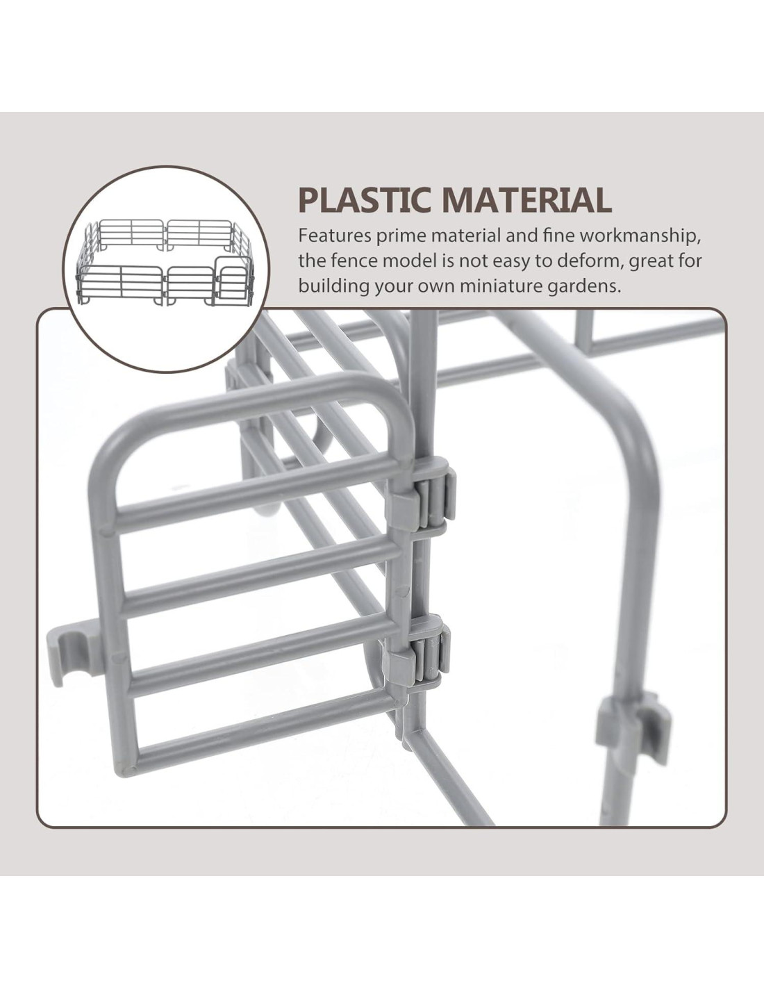 - Versátiles y Realistas: Las cercas de plástico cuentan con una forma realista y gran mano de obra, lo que las hace adecuadas para una variedad de propósitos. Ya sea que estés creando una escena temática de granja, un pueblo navideño o cualquier otro entorno en miniatura, estos juguetes de cerca seguramente cumplirán y superarán tus requisitos creativos.