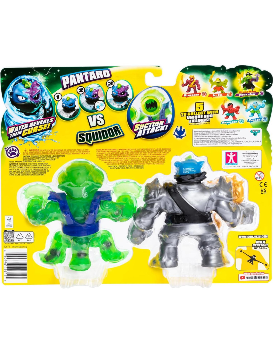 Los héroes de Goo Jit Zu Pantaro han sido absorbidos por el temido Mar de Goo Maldito dejándolo con una poderosa maldición! Cuando Pantaro se sumerge en agua helada, su cara sufre una transformación colorida, revelando la maldición! ¡Mira cómo su cabeza cambia de PLATA a PURPURA! Sin embargo, ¿serán los poderes de maldición de Pantaro junto con su ÚNICA MAZA DE PEZ GLobo lo suficientemente fuertes para derrotar a su malvado enemigo Squidor? ¡La lucha definitiva entre el bien y el mal espera bajo las olas mientras la EXCLUSIVA MAZA DE PEZ GLobo de Pantaro se pone a prueba contra el ataque de succión de Squidor! Los niños pueden estirar tanto a Pantaro como a Squidor hasta 3 veces su tamaño, así que asegúrate de desatar su ataque de estiramiento maldito definitivo! El Mar de Goo Maldito dejó a ambos Goo Jit Zu con 2 RELLENOS gooey ÚNICOS. ¡Aprieta y estira sus cuerpos para descubrir sus rellenos púrpura y verde! ¿Descubrirá tu hijo los otros 5 héroes de Goo Jit Zu absorbidos por el temido Mar de Goo Maldito? ¡Sumérgete en el Mar de Goo Maldito y emprende una aventura para descubrir los muchos secretos ocultos dentro!