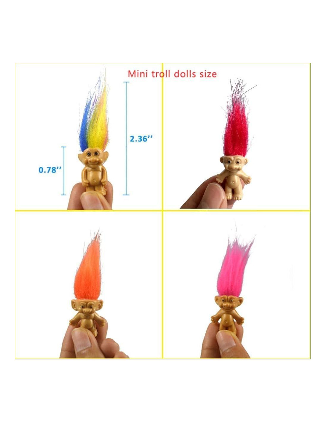 - [Paquete de Valor] Obtendrás 10pcs/20pcs/30pcs/40pcs figuras de muñecos troll mini con todo tipo de colores diferentes, la cantidad es abundante y los colores son ricos, pueden satisfacer tus diversas necesidades para crear y decorar. Los muñecos troll luminosos también brindarán una experiencia visual diferente a tu creación. Productos de diseño propio. No son muñecos troll originales.