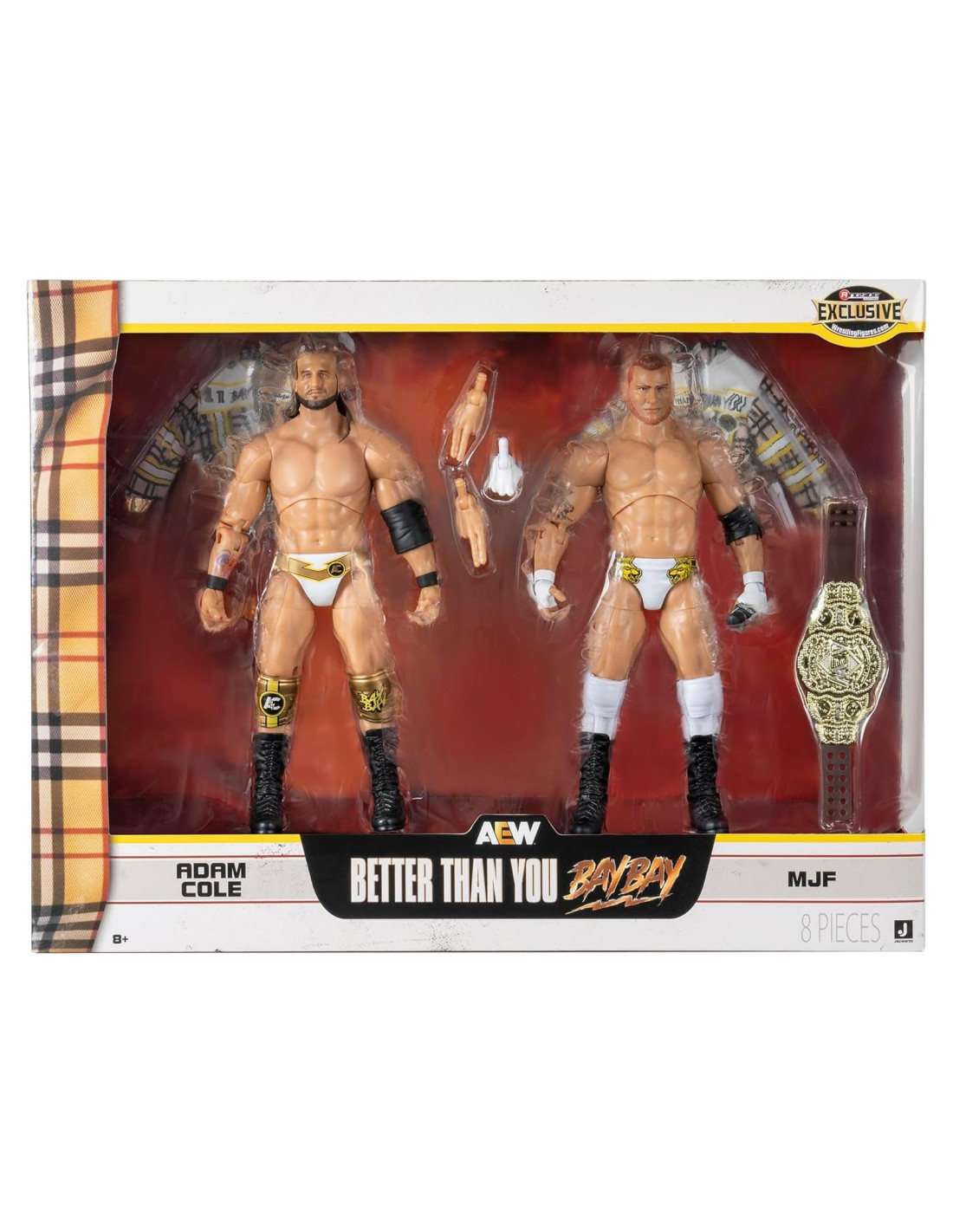 Mejor Que Tú Bay Bay (MJF & Adam Cole) - Paquete Exclusivo de Ringside AEW 2-Pack Figuras de Acción de Lucha Libre por Jazwares! Incluye los Brochacos de Adam Cole & MJF! Accesorios Incluyen: Cinturón de Campeonato Mundial AEW, 2 Chaquetas de Entrada, 2 Camisetas, Micrófono & Manos Alternativas!