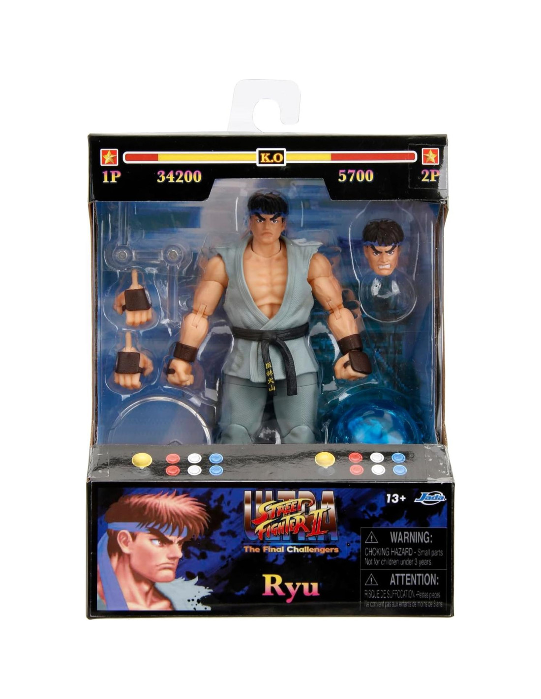 Prepárate para el enfrentamiento definitivo en un mundo donde la lucha callejera es el evento principal. Revive el mundo de tus personajes favoritos del videojuego Street Fighter II, ahora como figuras de acción a escala 1:12 de Jada Toys. Conocido por su altamente capacitado entrenamiento en artes marciales y fuerza, Ryu está en modo de batalla total y listo para enfrentar a sus enemigos. Viene equipado con manos y cabeza alternas, y el ataque característico de Ryu: Hadoken (una bola de fuego azul) para el golpe definitivo. Esta figura de 6" (15.24 cm) viene en un empaque de estilo arcade con características inspiradas en el juego. En este mundo, tú controlas cómo pelea Ryu. ¡Que comience la batalla!